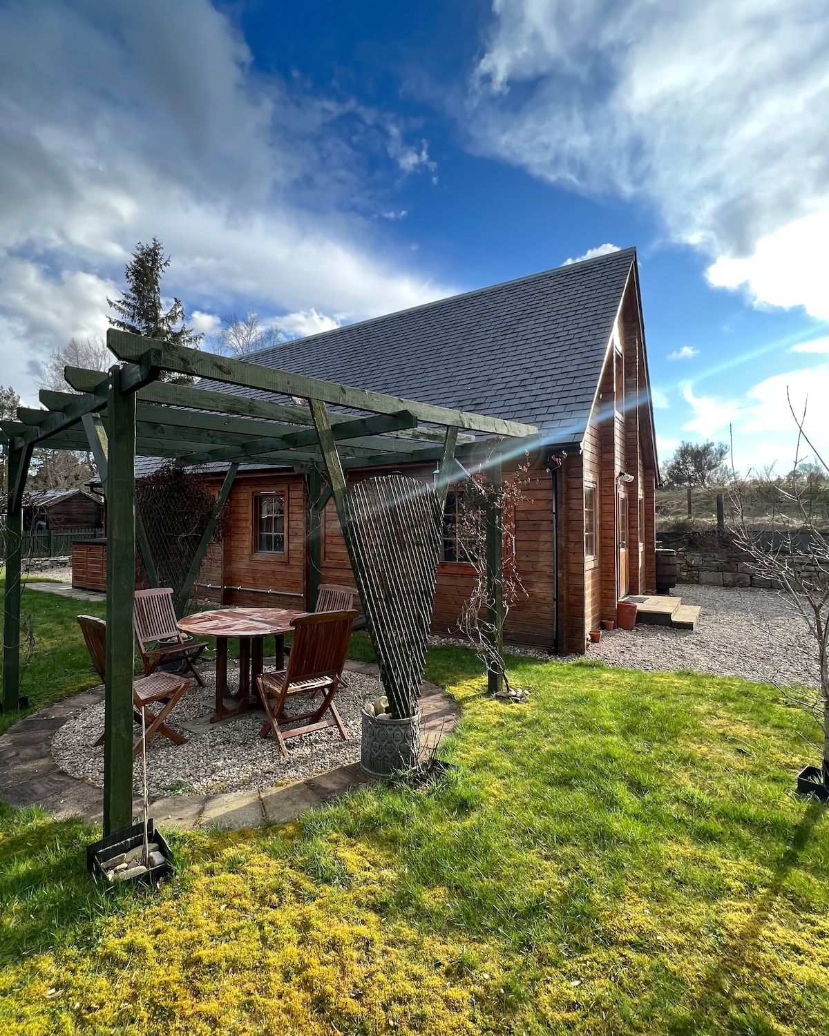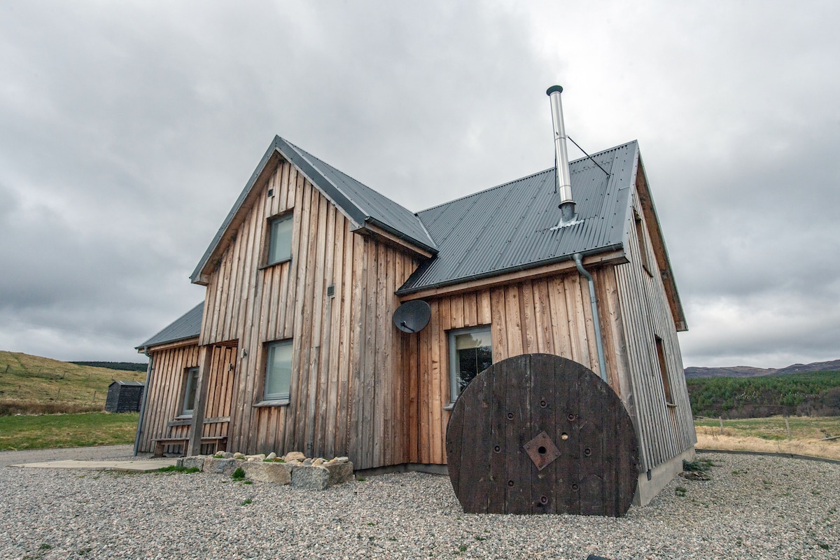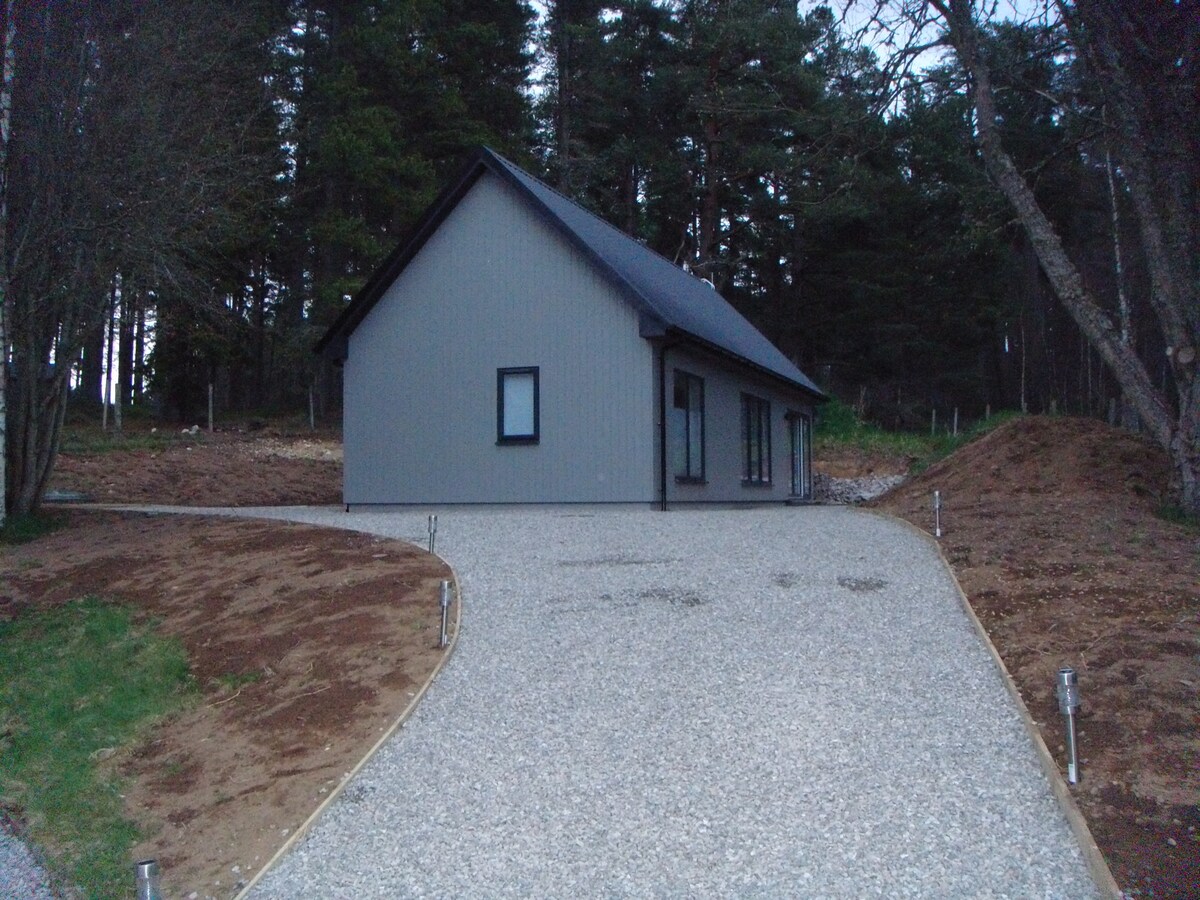 Petit chalet confortable avec poêle à bois, lit king size, couette et oreillers en duvet d'oie hongrois. Au bord des bois d'Anagach avec ses nombreux sentiers pédestres. À 10 minutes de la rivière Spey. Nous sommes à côté, mais vous aurez une intimité totale avec votre propre entrée, allée et parking. Cette région est un refuge pour la faune et il y a de très bonnes chances que vous aperceviez des écureuils rouges venant se nourrir sur la table à oiseaux à l'extérieur. Belle vue sur les bois et magnifiques couchers de soleil. Idéal pour les amoureux de la nature.