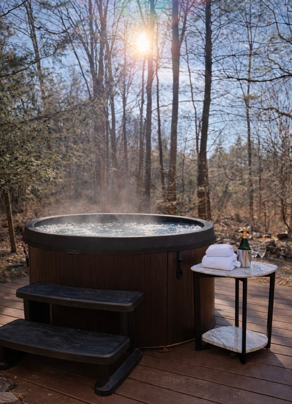 Retraite au sommet d'une montagne avec jacuzzi chauffé au bois
