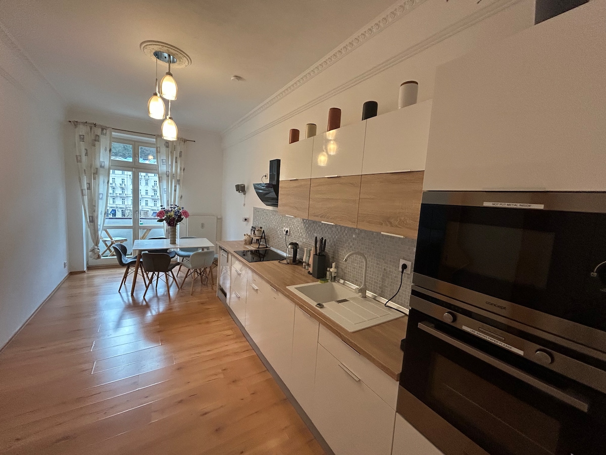 Appartement spacieux avec un emplacement absolument unique « au centre du centre » - au début de la colonnade du spa et à proximité de la rue Masaryk, sur laquelle et dans ses environs se trouvent de nombreux restaurants, bars, boutiques, etc. Toutes les chambres offrent une vue sur Sadová kolonáda (la colonnade du parc) et l'hôtel Thermal. Les chambres supérieures disposent de la climatisation. La cuisine est entièrement équipée. Place de parking gratuite dans un parking à environ 1,5 km de l'appartement. Convient aux couples et aux familles.