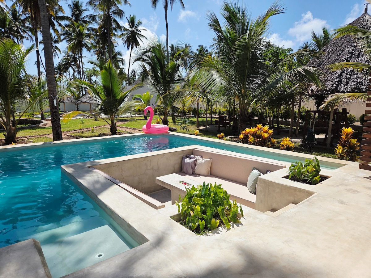 Une nouvelle villa entièrement meublée de 2 chambres avec une sécurité complète avec une piscine et un jardin étonnant, parfaite pour les lunes de miel, la famille ou les amis. Situé à Jambiani à moins d'un min à pied de la route principale, à 3 min à pied de la plage. À 5 min en voiture de Paje. En face du Shanti Cafe où vous pouvez obtenir des services comme le yoga, le petit déjeuner, le déjeuner et le diner Une intimité totale, y compris la piscine Détendez-vous en famille dans ce logement paisible.
