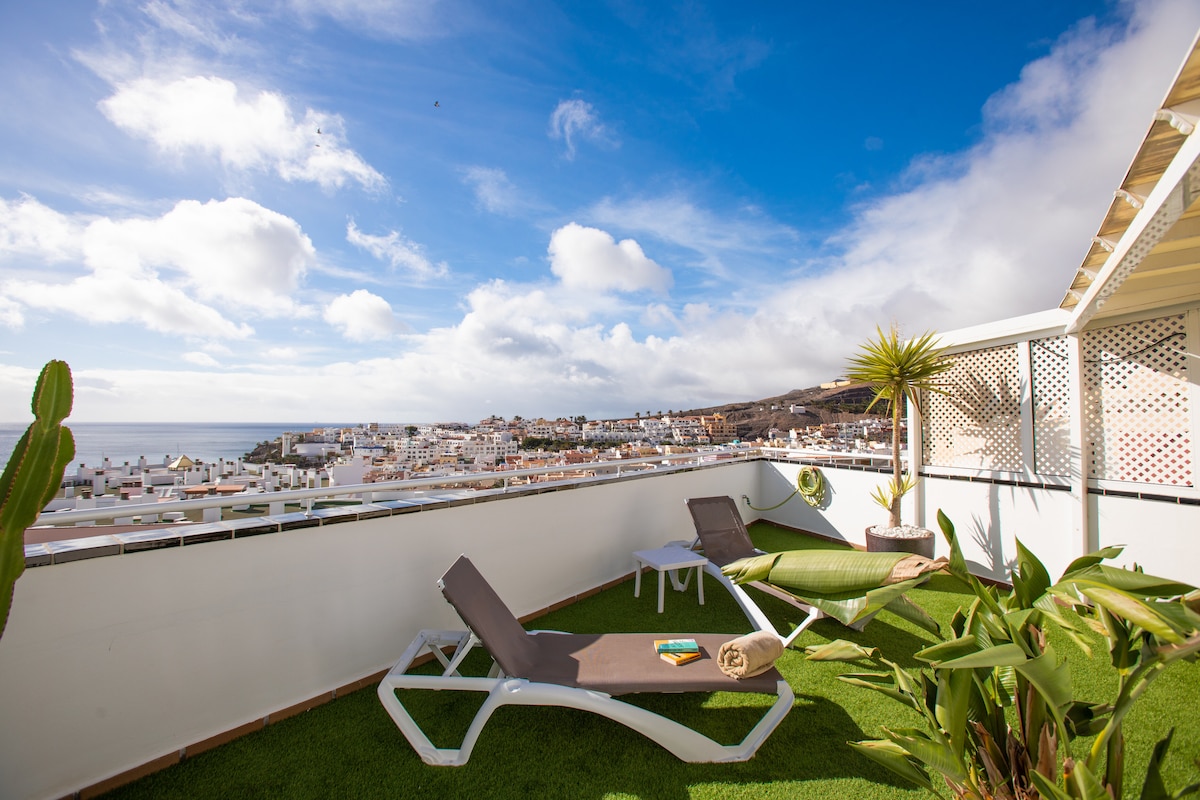 Oficial Vivienda Vacacional N° VV-35-2-00038 Appartement entièrement rénové, duplex de 120m2, et 2 terrasses de 50m2 chacune avec vue panoramique mer et village. Ce duplex est situé au coeur du village de Morro Jable, à 200m de la plage et de tous les commerces et restaurants. L’appartement est sécurisé avec une ALARME et télésurveillance. Un coffre-fort est à disposition.