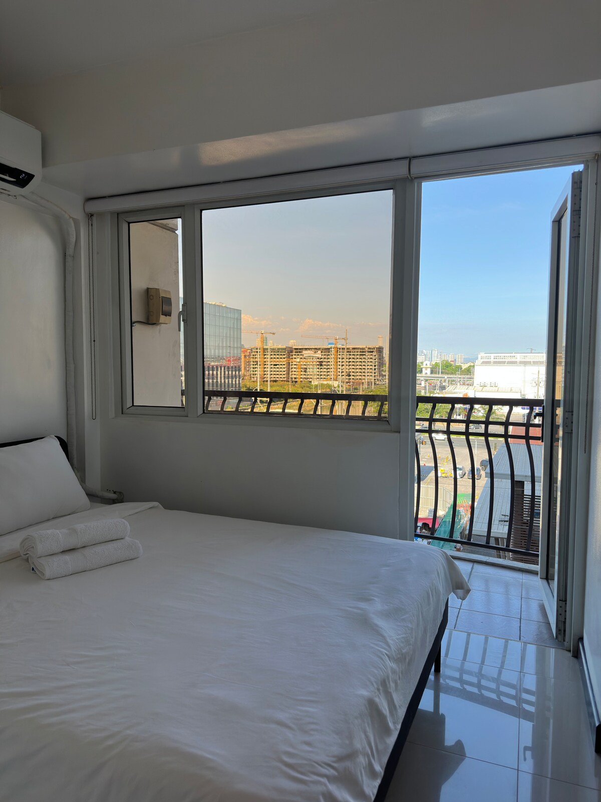 Notre appartement d'une chambre avec balcon au 8e étage de Solemare Parksuites offre une vue imprenable sur la ligne d'horizon de Makati. Il est accessible à tous les terminaux de l'aéroport de Manille via NAIAX et à quelques pas du Mall of Asia, de la MOA Arena et des salles de concert, d'IKEA, d'Ayala Malls Manila Bay, du DFA, du centre de demande de visa américain de Parqual Mall et des casinos à proximité. Le 3e étage dispose d'équipements tels qu'une piscine et un terrain de basket, avec une supérette, McDonald's et Starbucks à l'extérieur du bâtiment.