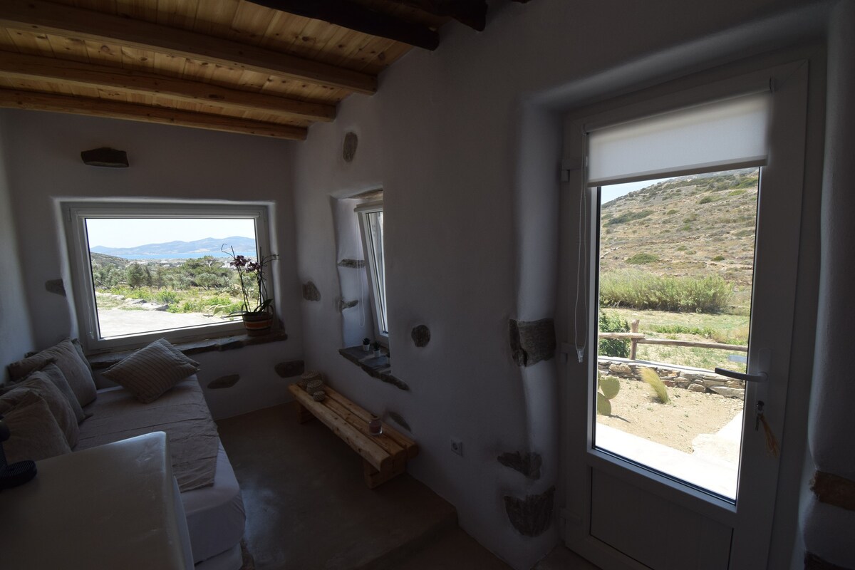 Un studio de 30 m ² idéalement situé avec une vue romantique unique sur le coucher du soleil, à moins de 1 km de la ville principale de Parikia. Une véranda spacieuse avec une table à manger en marbre, une chambre confortable avec une salle de bain et une cuisine entièrement équipée. Le studio est à seulement 10 minutes à pied de la vieille rue du marché et à quelques minutes en voiture des célèbres plages de Paroikia.