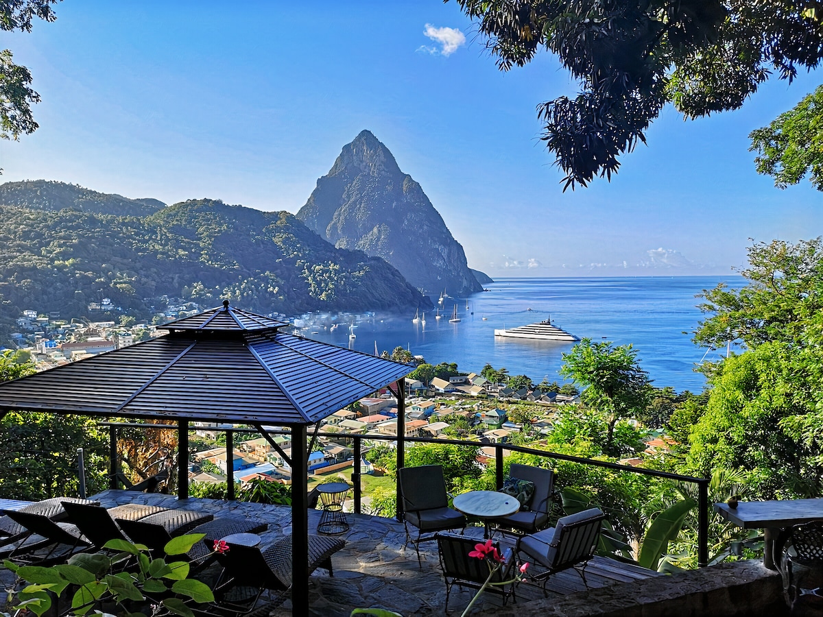 Vue panoramique sur les Pitons avec spa, piscine et petit déjeuner