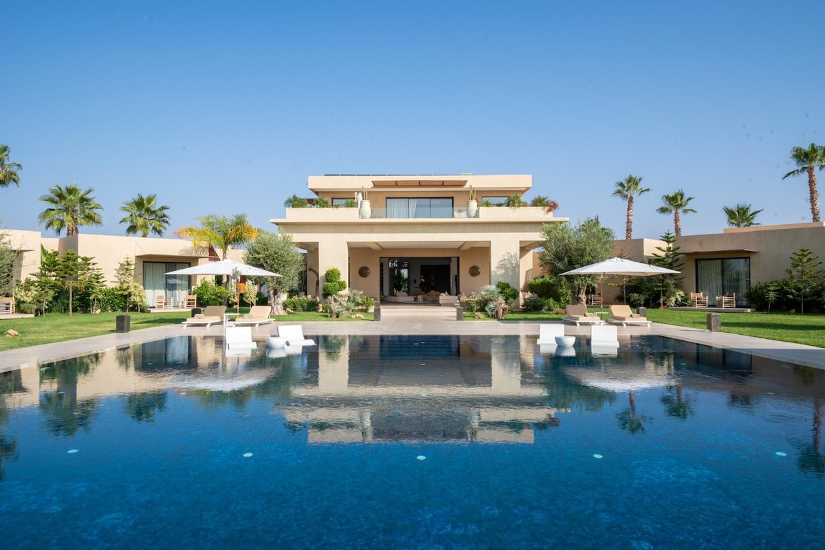 Escape to a luxurious haven at this stunning 2-hectare villa, just 25 minutes from the heart of Marrakech. Surrounded by an award-winning garden, this property offers an enchanting blend of tranquility and beauty, perfect for those seeking a peaceful retreat. Imagine wandering through lush landscapes, relaxing under shady palms, and soaking in breathtaking countryside vistas--all in absolute privacy. Your stay includes a private chef who crafts exquisite local dishes using fresh ingredients from the organic garden, ensuring a culinary experience that delights the senses. For those craving the vibrant flavors of Marrakech, the lively Jemaa el-Faa is just a short journey away. Villa Shah seamlessly marries modern luxury with traditional Moroccan charm. Its spacious, beautifully appointed interiors feature ornate tiling and rich tapestries, creating an inviting atmosphere. Enjoy state-of-the-art amenities and unwind by one of the largest residential pools in Marrakech, a perfect spot for leisurely afternoons under the sun. Explore the nearby Souks for unique Moroccan treasures or revel in the excitement of street performers in the town square. Architectural enthusiasts will appreciate the stunning Koutoubia Mosque, while Jardin Majorelle offers a serene escape into nature. This villa is more than just a place to stay--it's a sanctuary that offers unforgettable experiences and lasting memories. Make your getaway truly special by booking your stay at this exceptional estate, where every detail is designed for your comfort and enjoyment. BEDROOM & BATHROOM • Bedroom 1 - :Primary: King size bed, Ensuite bathroom with stand-alone rain shower & jetted bathtub, Dual vanity, Walk-in closet, Fireplace, Lounge area, Safe, Television, Private balcony, Outdoor furniture, View of pool & Atlas Mountains • Bedroom 2: King size bed, Ensuite bathroom with stand-alone bathtub, Walk-in closet, Television, Sofa, Direct access to balcony, Outdoor furniture, View of pool & Atlas Mountains • Bedroom 3: Queen size bed, Ensuite bathroom with shower/bathtub combo, Walk-in closet, Television, Sofa, Direct access to balcony, Outdoor furniture, View of pool & Atlas Mountains • Bedroom 4: Double size bed, Ensuite bathroom with stand-alone shower, Walk-in closet, Television, Direct access to balcony, Outdoor furniture • Bedroom 5: Double sized bed, Ensuite bathroom with stand-alone shower FEATURES & AMENITIES • Decorative fireplace • Solar electricity system • Organic vegetable and fruit garden • More under “What this place offers” below OUTDOOR FEATURES • Outdoor living space • Organic vegetable and fruit garden • 500m running track • Terraces • Pergola STAFF & SERVICES Included: • Gardener - 3 times per week Extra Cost (advance notice may be required): • Airport transfers from Marrakech Airport €40 for van • Activities and excursions • Masseuse • Babysitting services • Lunch and dinner by arrangement at extra cost €30 per person