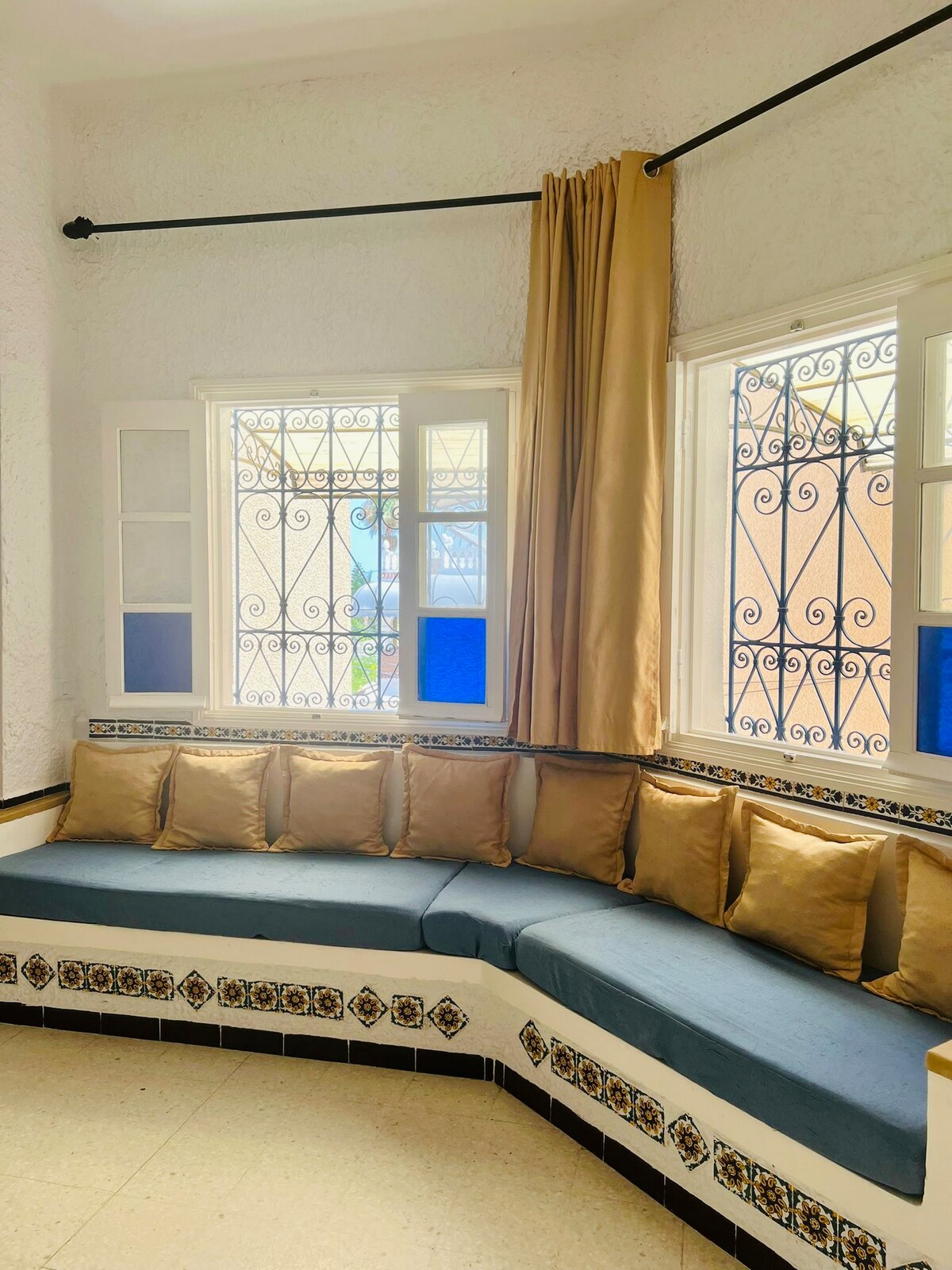 El houch est un appartement décoré dans un style tunisien traditionnel affichant un style unique et typique. 2 min à pied de la plage. 3 km de Port El Kantaoui ( port de plaisance ) 3 km du Mall Of Sousse ( Boutiques, Cinema, parcs enfants et restaurant ) 12km du centre-ville de Sousse (Médina de Sousse , Musée Archéologique, Ribat) 13 km de Hergla