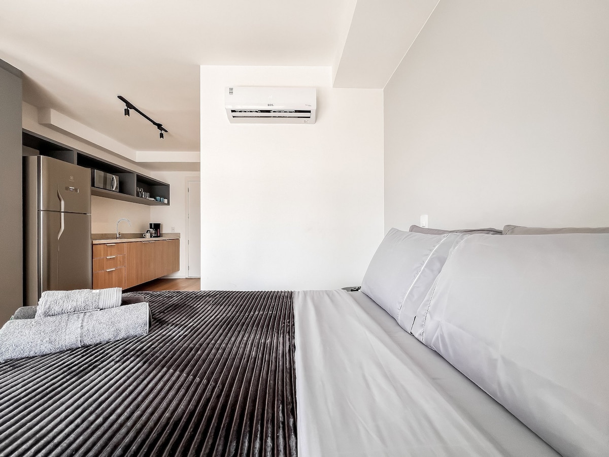 APPARTEMENT SERVICE DE RÉSIDENCE SUPER MODERNE À 200M DE LA CÉLÈBRE AVENIDA PAULISTA. Appartement confortable et moderne avec service de résidence pour 2 personnes (tiers en option) avec cuisine et balcon. Fenêtres anti-bruit, climatisation et Wi-Fi gratuit. Appartement de 45m2, avec balcon et cuisine.