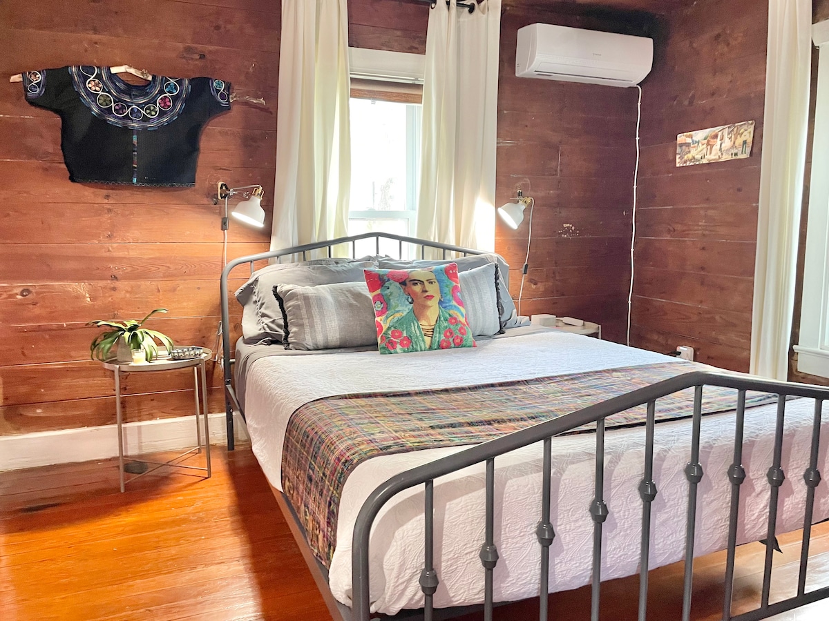 Ce bungalow Frida confortable est un mélange parfait de charme et d'emplacement ! Niché dans un quartier animé et à quelques pas de superbes bars, restaurants et cafés. À l'intérieur, détendez-vous dans le salon au cèdre avec un canapé confortable et une ambiance audacieuse et amusante. Balade à vélo au lac Lady Bird ! En face du Mercado Sin Nombre. Élu parmi les 15 meilleurs cafés des États-Unis ! - Télévision intelligente - Café et en-cas offerts ! - Salle de bain aux pieds de mer. - Cafetière goutte-à-goutte. - Petite cour clôturée - Épicerie HEB à quelques pâtés de maisons