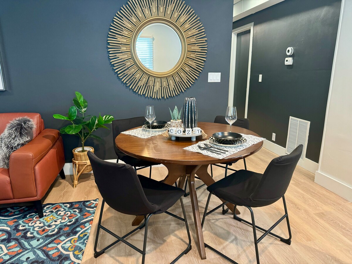 Suite spacieuse et luxueuse dans le centre-ville historique ! La cuisine complète, la salle à manger et le salon font de cette propriété rénovée une maison paisible loin de chez vous. Marchez jusqu'aux restaurants, Moccasin Springs, Evans Plunge et plus encore. CUISINE COMPLÈTE : des voyageurs ont préparé leur dîner de Thanksgiving ici ! Bien approvisionné en couteaux tranchants, planches à découper et options de café. BUREAU : idéal pour le télétravail avec une connexion wifi rapide et un bureau dédié. DÉTENTE : connectez-vous à vos propres services de streaming sur notre téléviseur 55" dans le séjour.