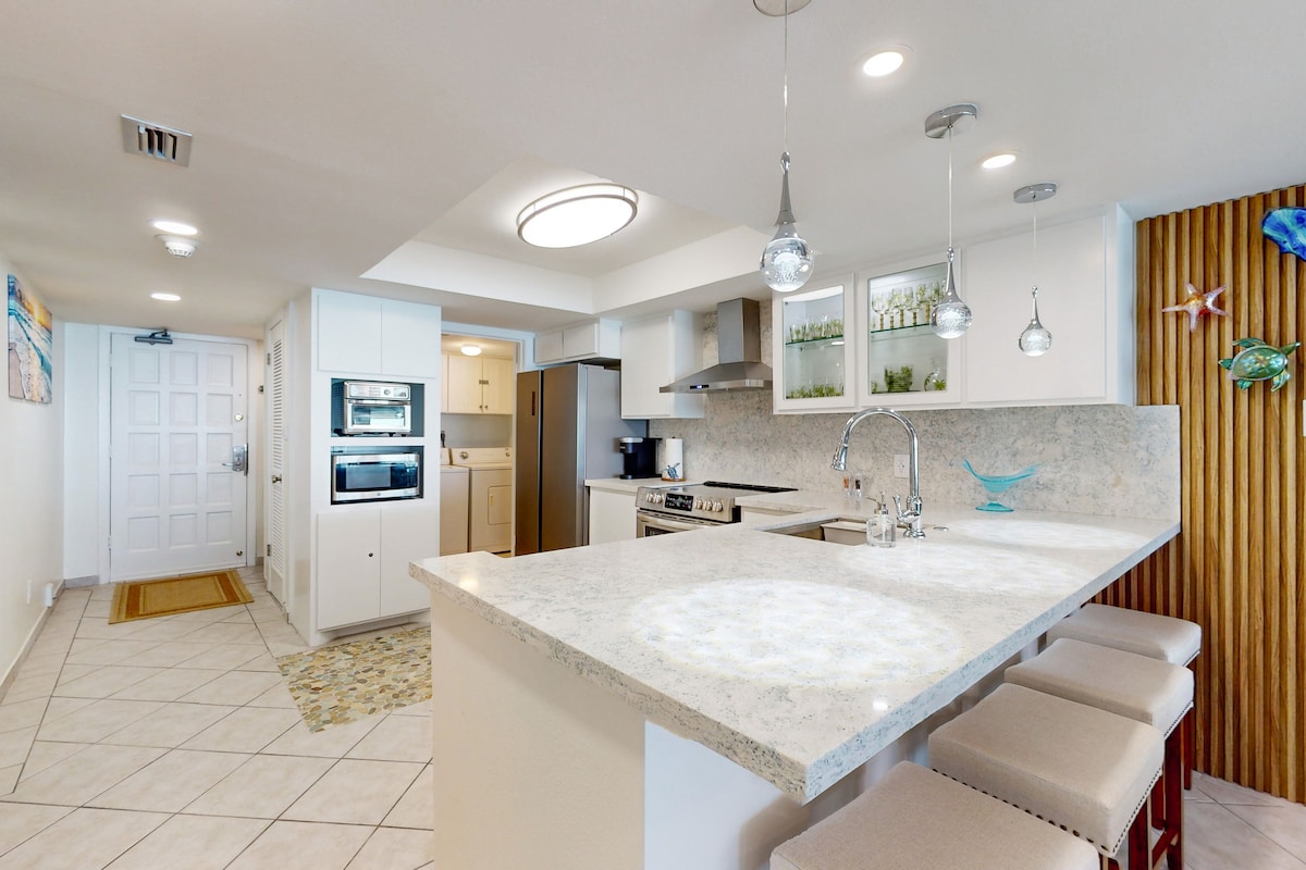 Vue ★partielle sur l'océan et la baie ! À 2 minutes à pied de la plage ! Wifi ★rapide, entrée sans clé, télévision par câble Netflix Nettoyage, désinfection et assainissement★ 5 étoiles. Appartement d'★angle avec fenêtres du sol au plafond. ★Beaucoup de boutiques/restaurants accessibles à pied. Piscine ★chauffée, jacuzzi et solarium. Chaises de★ plage, serviettes de plage, planches de corps et jouets de plage fournis - GRATUITS ★Regardez les feux d'artifice depuis votre balcon privé. Les stores★ motorisés offrent de l'intimité. Cuisine ★entièrement équipée avec tout ce dont vous aurez besoin. Lit ★confortable = votre endroit parfait