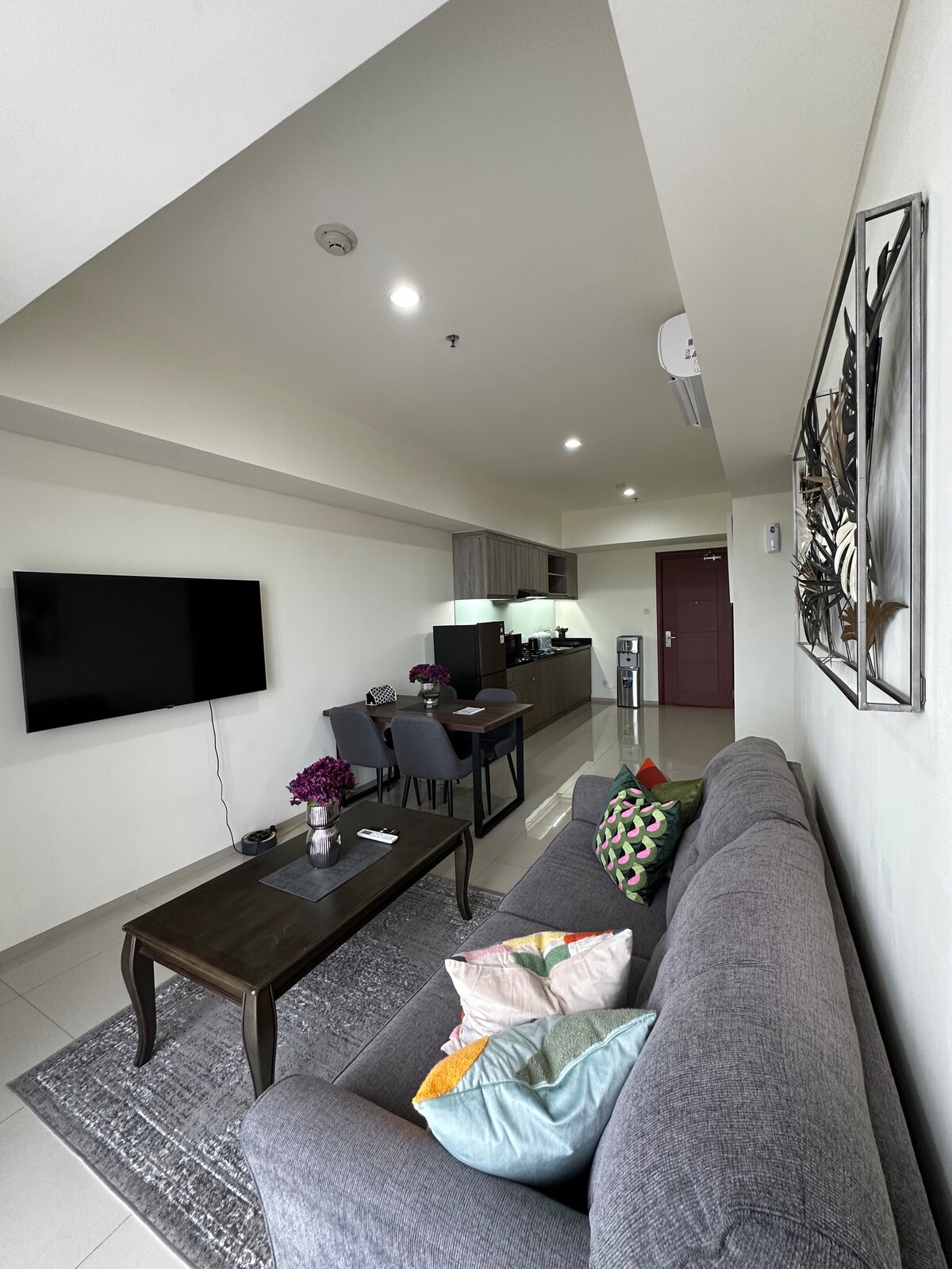 Bienvenue dans notre confortable appartement de ✨2 chambres ✨ niché au cœur de BSD City. Parfait pour les familles ou les petits groupes, notre logement offre une atmosphère confortable et accueillante pour votre séjour. En entrant, vous serez accueilli par un salon spacieux avec un mobilier moderne et beaucoup de lumière naturelle. La cuisine entièrement équipée est idéale pour préparer de délicieux repas, avec un coin repas où vous pourrez en profiter ensemble. Nous avons hâte de vous accueillir et de vous assurer un séjour inoubliable !