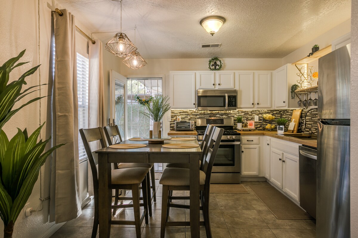 Bienvenue à The Townhome @Sunport, un joyau caché. Une communauté fermée tranquille de maisons construites en 2014, offrant une maison de ville spacieuse de 2 étages 5 chambres 5 salles de bain dans la région de Sunport d'Albuquerque. À seulement 2,7 miles de l'UNM et de Nob Hill. Profitez d'une cuisine raffinée, d'art et de superbes lieux nocturnes. Proche du site de l'International Balloon Fiesta, des casinos, du parc de balles, de l'aquarium ABQ et du jardin botanique. Notre propriété dispose de nombreux équipements, ce qui rend cette location parfaite pour les familles et les amis à la recherche d'aventure et de détente.