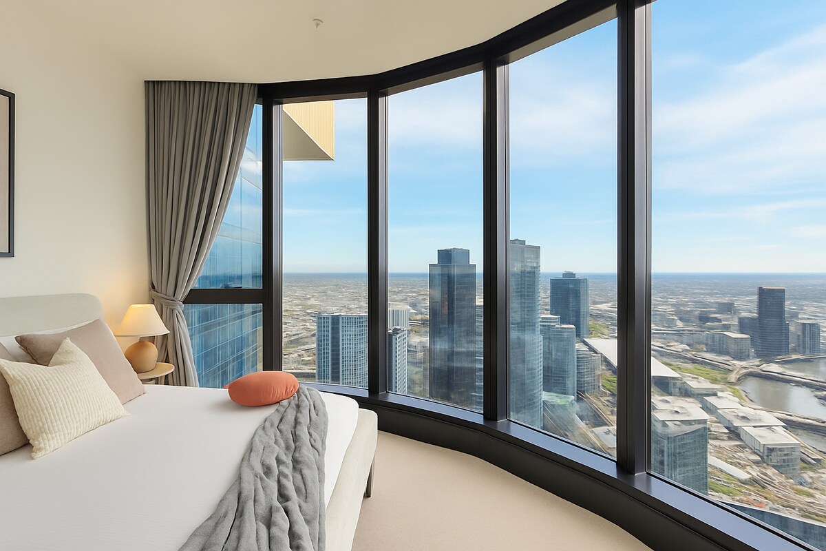Balcon avec vue sur l'océan et Southern Cross dans le quartier des affaires de Melbourne