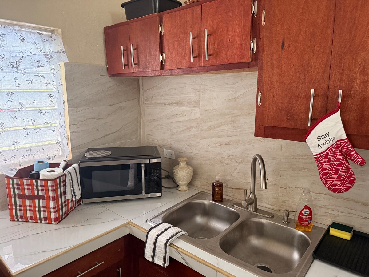 Meublé, spacieux 2 chambres 1 salle de bain, entièrement climatisé, buanderie sur place et wi-fi situé au centre de l'île. Proche du centre commercial, du centre commercial, des restaurants de restauration rapide, des banques, des épiceries, des bureaux de poste, de l'hôpital, des centres de soins d'urgence, des installations de blanchisserie, du Home Depot, de la distillerie Captain Morgan Rum, des pharmacies, des stations-service, du cinéma et à environ 12 minutes en voiture de l'aéroport, des plages et des services de ferry QE IV.
