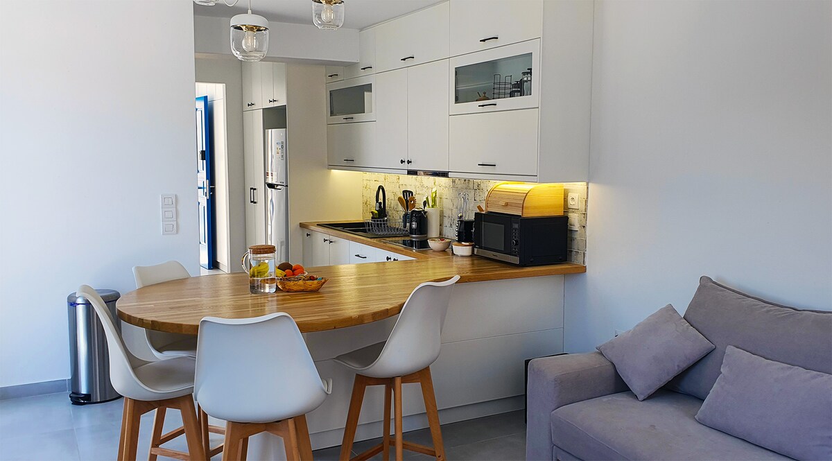 Studio fraîchement rénové à Armenistis, situé dans le centre historique du village et à côté de la plage des villages. Le supermarché, les restaurants et tout ce dont vous avez besoin sont accessibles à pied. Le wifi, la climatisation et une cuisine entièrement équipée en font un lieu de vacances idéal. Comme ma famille a ses propres jardins et le poulet, nous fournirons des friandises fraîches pour accompagner vos repas.
