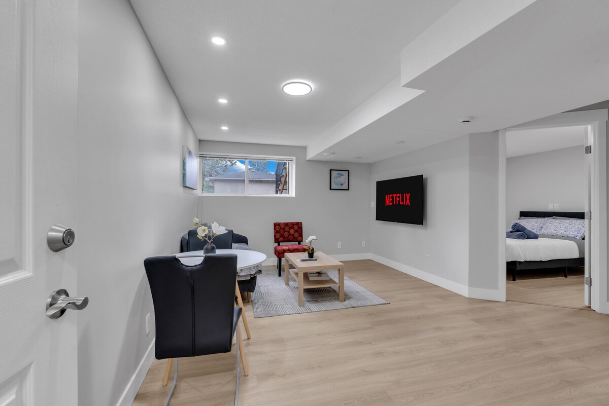 L'élégant sous-sol de plain-pied de 2BR est une retraite privée et méticuleusement organisée offrant un confort raffiné et un luxe tranquille. Profitez de soirées chaleureuses près de la cheminée et d'une lumière naturelle abondante grâce aux grandes fenêtres. Cette suite spacieuse de deux chambres dispose d'un lit queen size et d'un lit double, idéal pour les voyageurs qui apprécient l'intimité, la propreté et un niveau de confort élevé. L'accès direct à la cour arrière et le stationnement dédié dans l'allée sont inclus. À quelques pas des sentiers de la rivière Bow, de Sobeys, de Seton YMCA et de l'hôpital South Health Campus.