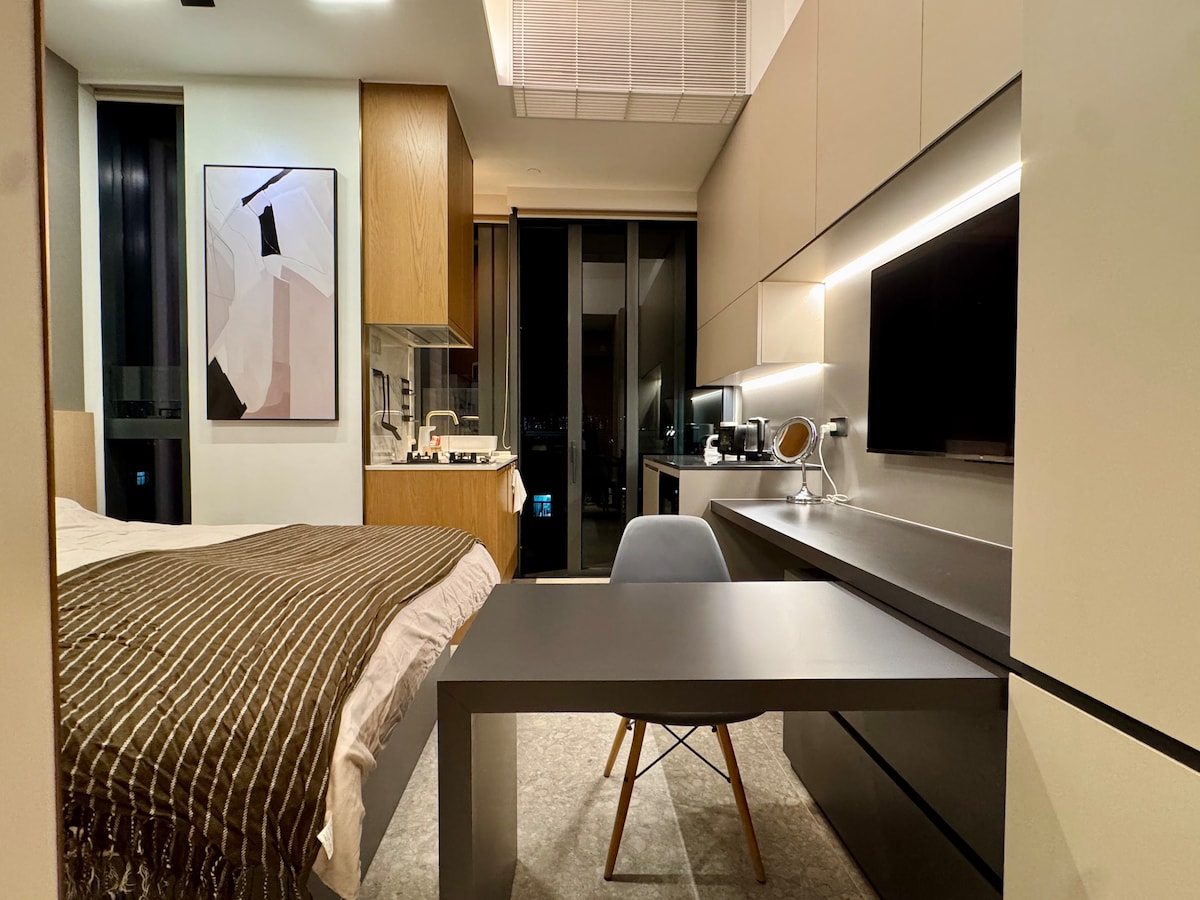 Cet endroit unique a un style qui lui est propre avec une infinité d'espaces de rangement soigneusement conçus pour répondre à vos besoins d'une belle manière. Le plan de travail tourne dans une belle table à manger pour 2 personnes ou une extension pour votre espace de travail. Profitez du cœur de Soho East, avec 2 étages de club-house et de salle de sport partagés. Un joyau parfait pour créer une maison branchée loin de chez vous pendant votre séjour.
