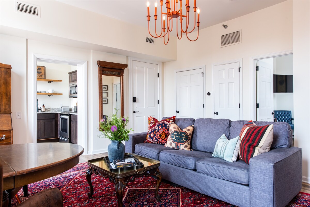 Bâtiment rénové construit dans les années 1880 au cœur du centre-ville de Versailles. EH Taylor • 1 chambre/grand lit King Size, 1 salle de bain entière • Cuisine complète • Salon • 2 téléviseurs intelligents • Stationnement sur place À distance de marche des cafés, restaurants, bar bourbon, boulangerie. À 11 min de Keeneland À 15 min des distilleries 12 min de l'aéroport de Lexington À 50 miles de Louisville * Équipements hors site - piscine publique et quai pour bateau. Pour en savoir plus, consultez la section Activités sur place. Contrat de location requis