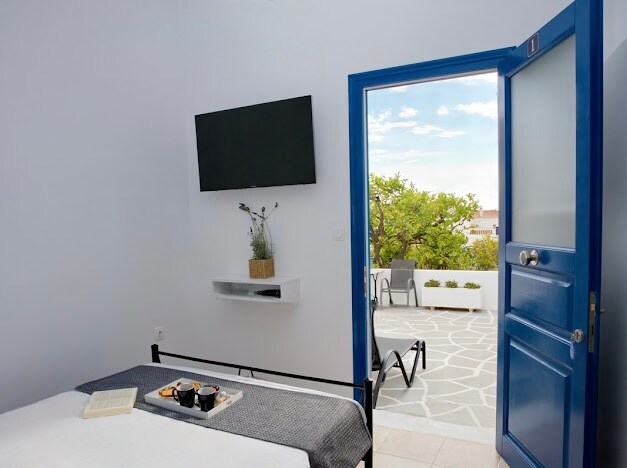 Profitez de votre séjour dans cet espace paisible au centre de l'île ! Notre appartement est à seulement cinq minutes à pied du port central. Il s'agit d'un espace donnant sur la plage centrale d'Agios Mammas, adapté aux couples et aux petites familles. L'espace dispose d'un lit king size, d'un canapé-lit pour deux personnes, ainsi que d'un lit bébé. Les deux plages les plus centrales de l'île se trouvent à seulement 100 mètres !