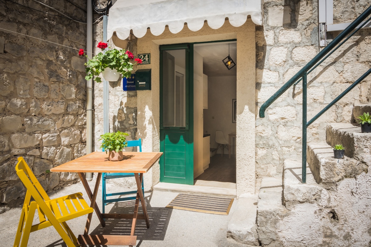 Charmant appartement au cœur du palais de Dioclétien. Récemment rénové, adapté à la maison en pierre est moderne décoré avec des éléments traditionnels. Idéalement situé. Entièrement équipé avec tous les équipements. Se compose d'une chambre spacieuse avec le lit queen size, la salle de bain et le salon (canapé-lit double extensible) relié à la cuisine. Cet endroit paisible vous fait sentir l'esprit de la ville méditerranéenne avec une histoire riche à portée de main. Le port,les principales gares routières et ferroviaires sont à 5 minutes à pied.