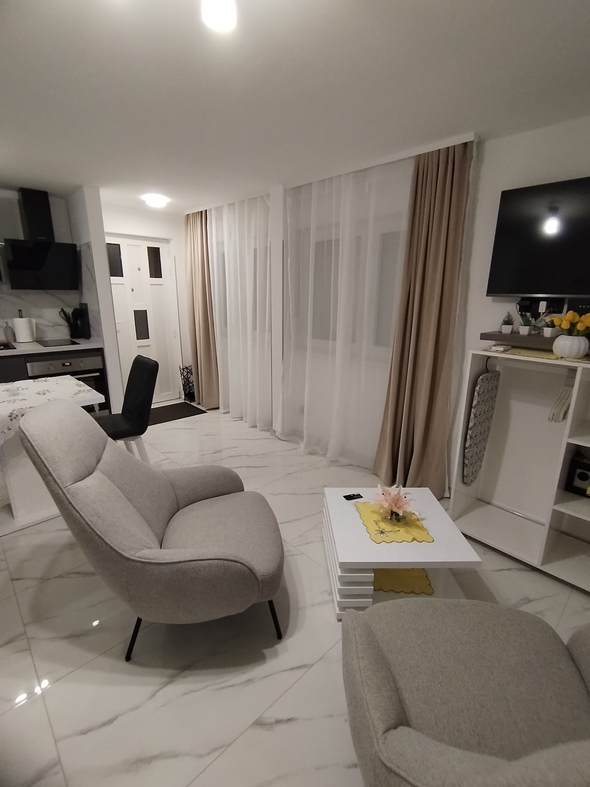L'appartement meublé de façon moderne dispose d'une chambre avec une climatisation séparée, une télévision et un éclairage moderne. La cuisine est équipée d'un lave-vaisselle, d'une plaque céramique, d'un micro-ondes et de tout l'équipement. Le salon dispose de canapés pour une troisième personne et sa télévision et climatisation. L'appartement dispose d'une belle terrasse donnant sur la mer, d'un salon ancien et de Split. Vous pourrez utiliser notre piscine et notre barbecue dans le jardin.