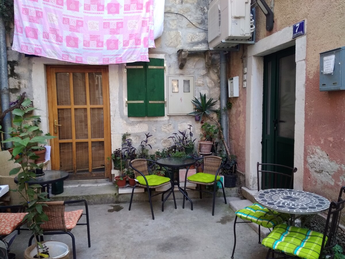 Bienvenue au Studio Andriana ! Nous sommes situés au cœur de la vieille ville, à seulement 300 m à pied du palais de Dioclétien et de la promenade Riva. Si vous arrivez par la mer ou en bus, nous sommes à seulement 500 m du port de ferry et de la gare principale. De plus, la célèbre plage de Bačvice est à seulement 350 m ! Vous séjournerez dans un lieu historique : notre maison est un bâtiment en pierre vieux de 450 ans. C'est un monument culturel protégé situé dans le quartier historique et charmant de Lučac