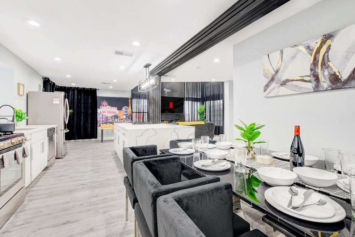 Bienvenue chez vous loin de chez vous dans le quartier animé de Las Vegas ! Cette spacieuse maison de 3 chambres et 2,5 salles de bain jusqu'à 6 personnes est située dans une communauté paisible et fermée, offrant le mélange parfait d'intimité et de commodité. À distance de marche du centre commercial, des restaurants, de la gare routière et à quelques minutes de l'effervescence du Las Vegas Strip, des hôtels, des casinos, de l'aéroport, du stade Allegiant et de la T-Mobile Arena . Vous ou votre famille pouvez profiter de tous les divertissements de la ville, puis retourner dans votre retraite paisible