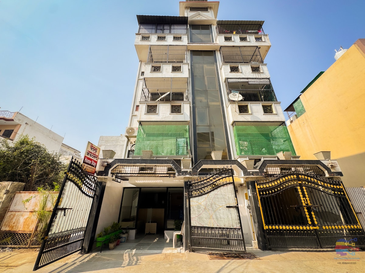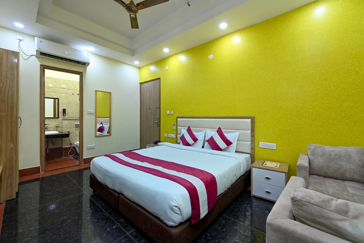 Peaceful modern stay within walking distance of Prem Mandir and Iskcon Temple. Comfortable king-size bed, AC, WiFi, and clean attached bathroom. Perfect for families, couples, and pilgrims seeking comfort near the temples.