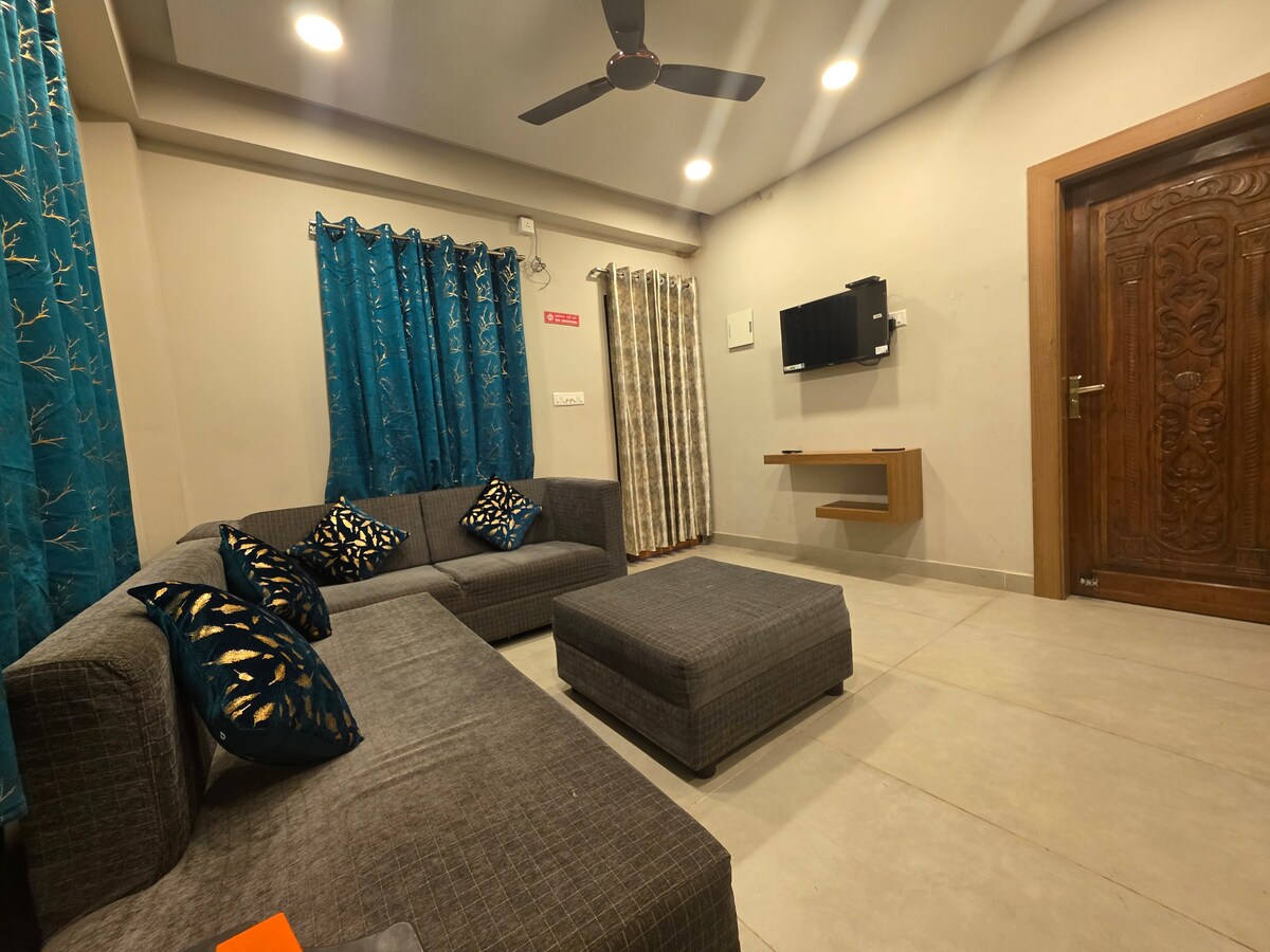 Ce logement élégant est idéal pour les voyages en groupe. Son appartement confortable, paisible, chaleureux et spacieux de 2 chambres, situé au 1er étage. Il y a un lit King size, un lit Queen size, un lit supplémentaire et un canapé-lit. Il y a une télévision connectée de 43 pouces dans le salon pour le divertissement. En plus de l'espace salon et salle à manger, il y a une cuisine spacieuse, entièrement équipée avec tous les ustensiles nécessaires. La cuisine dispose d'un réfrigérateur, d'une cuisinière à gaz et d'un filtre RO