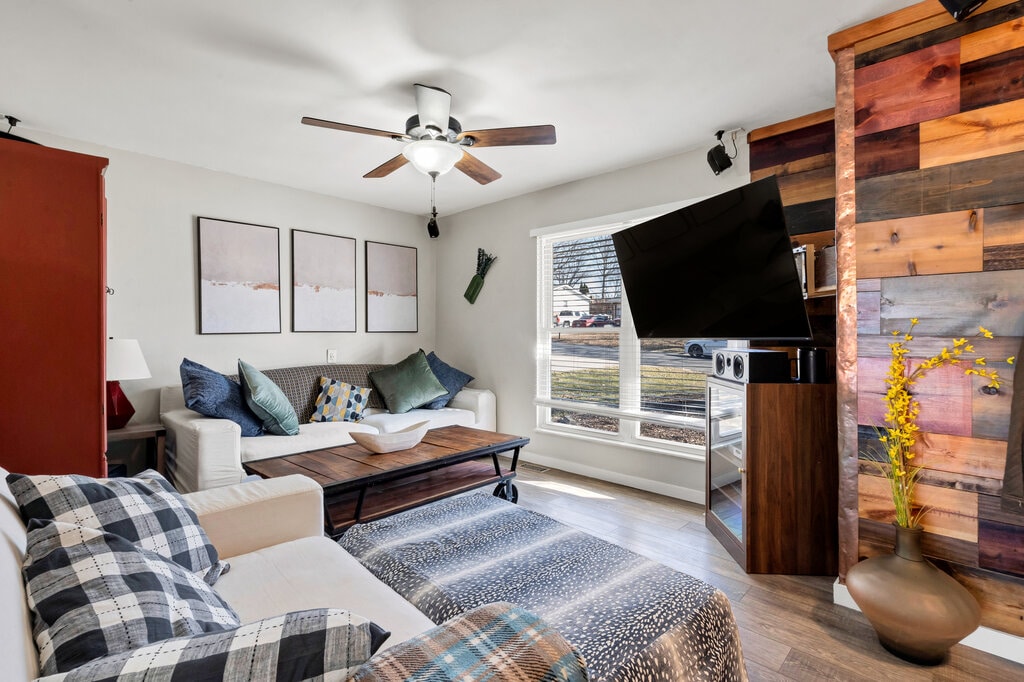 Experience luxury and style in our St. Louis home. This residence offers 2 modern bedrooms upstairs, while the main level features a cozy living room, fully equipped kitchen, stylish bathroom, a beautiful bunk bed, and a modern work-from-home setup with high-speed Wi-Fi—blending elegance and comfort. Nestled in a secure community near Delmar Loop, it’s the prime spot for local events. With top-tier amenities, plush bedding, and ample parking, we promise a flawless St. Louis stay.
