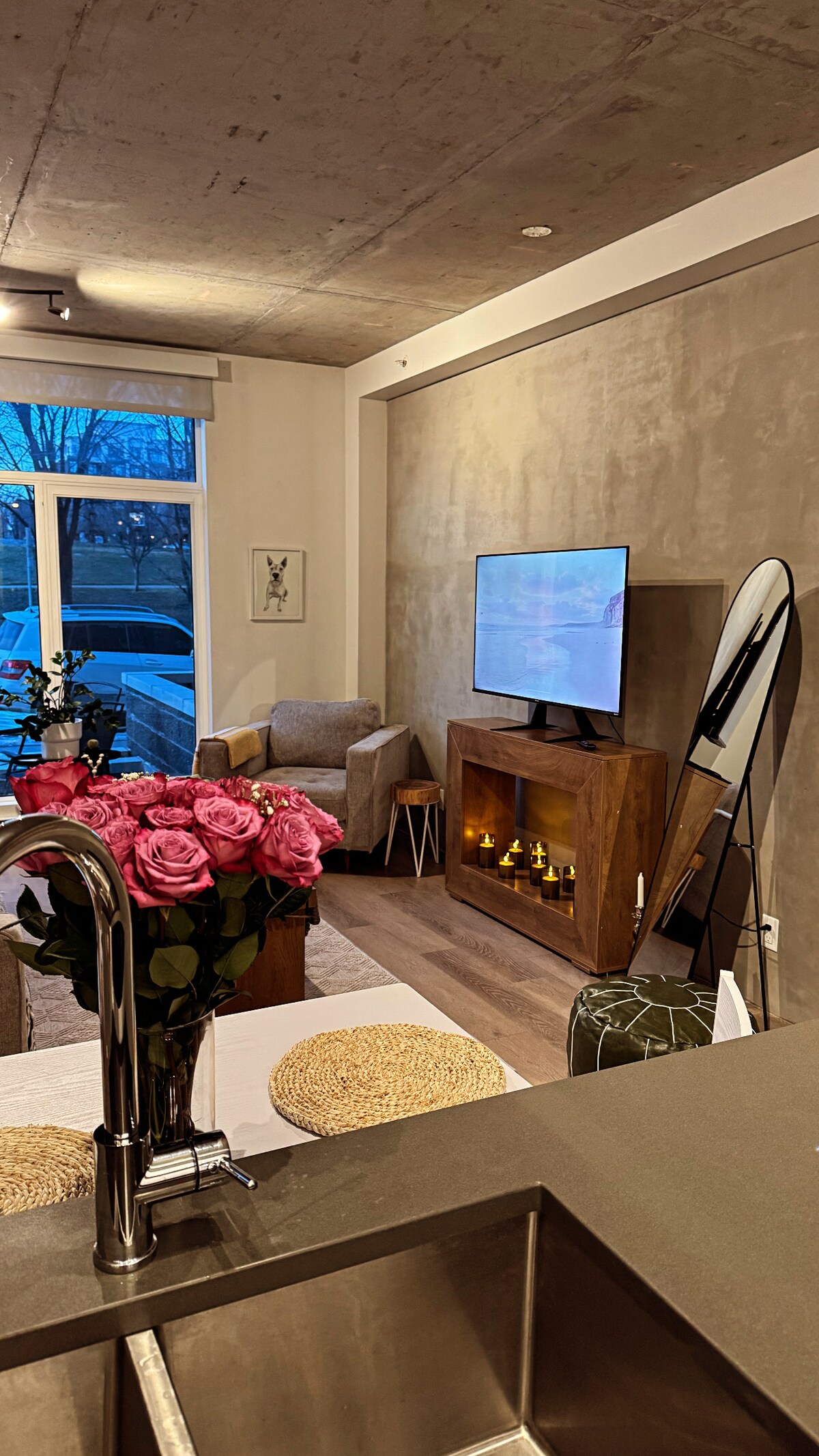 - Spacious 1-bedroom condo with tall ceilings - King size bed with lots of pillows - 55" TV with Apple play - Fast Wifi - Fully equipped kitchen - Underground Parking - Beautiful view of the Calgary city skyline. - Located in Inglewood, you will find local breweries, coffee shops, top restaurants, live music, and shopping - The Bow river, steps from your door! - Walking Distance to Stampede grounds - Watch the fireworks from the patio