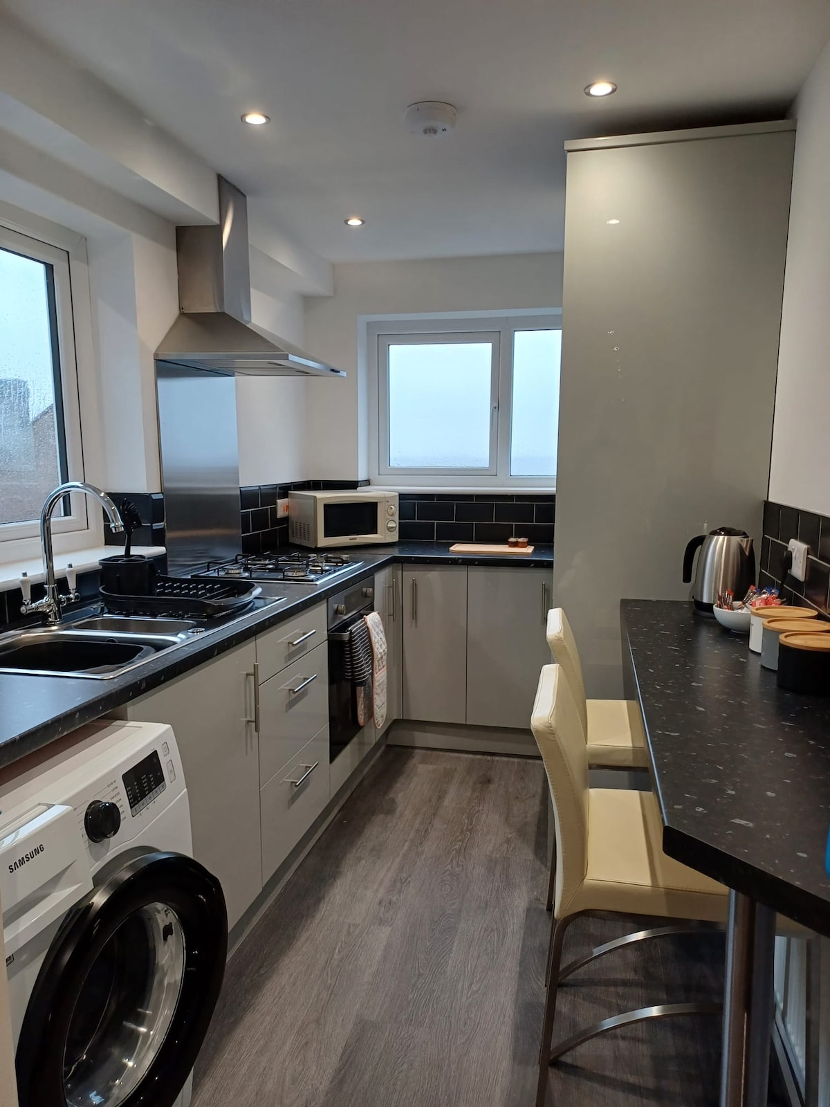 Appartement très spacieux réparti sur 2 étages, meublé avec goût, avec de hauts plafonds, des caractéristiques d'époque uniques et un bel escalier. 2 chambres (la 2e chambre peut être composée de 2 lits simples ou doubles si nécessaire), cuisine-salle à manger, salon avec télévision connectée, salle de jeux/bureau, salle d'eau attenante et salle de bain de luxe. Parking privé gratuit en dehors de la rue pour 2 voitures à l'appartement. Idéalement situé en plein centre de Leek, à quelques pas de tous les pubs, restaurants, cafés, bars et boutiques.