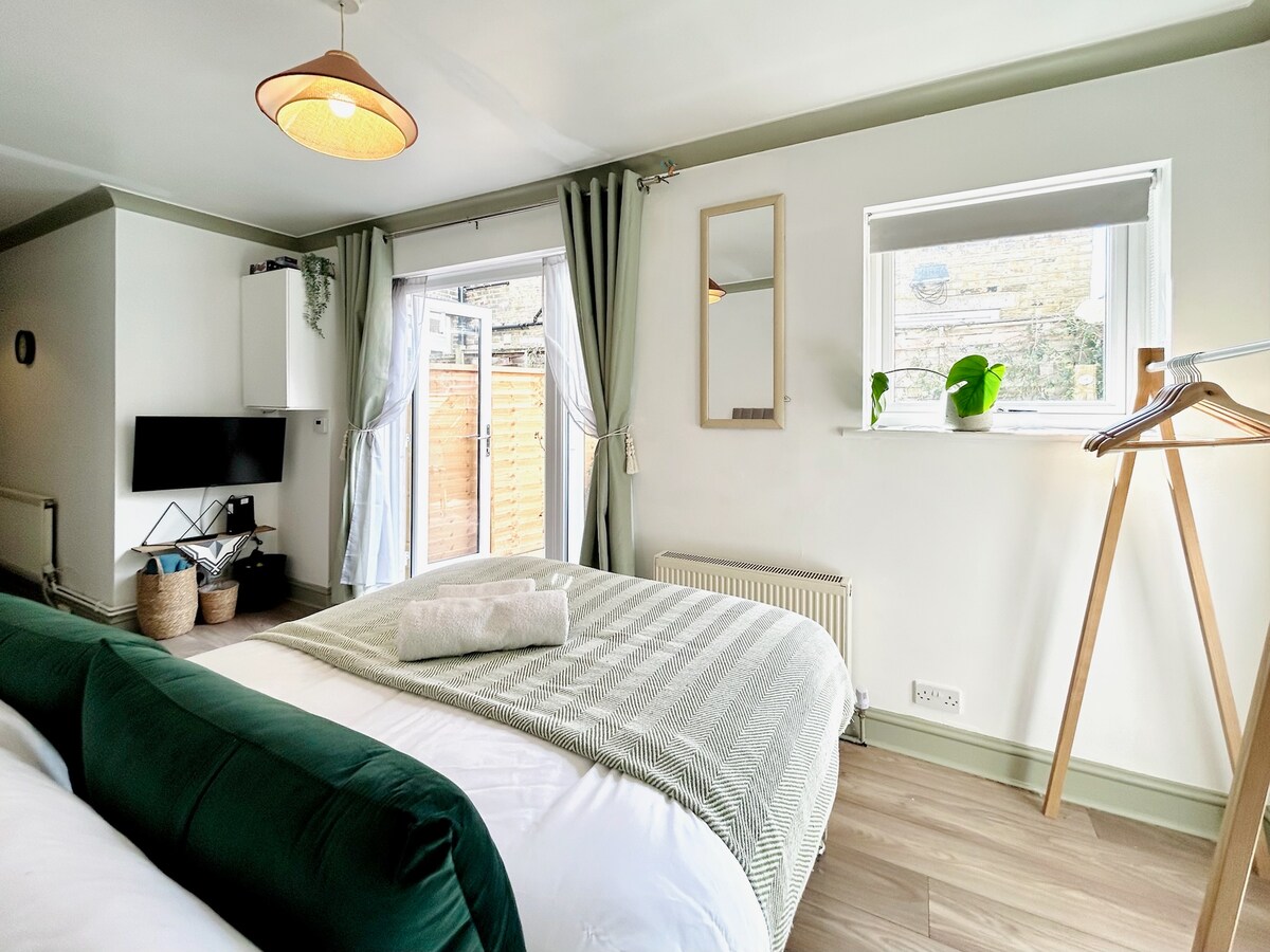 Ce studio central, confortable et compact offre le mélange parfait de style et de confort. Sortez dans un charmant patio privé, idéal pour le café du matin ou le déjeuner en plein air. À l'intérieur, vous trouverez une télévision connectée avec des applications de streaming, un lave-linge/sèche-linge et un four pratique en vente libre pour plus de facilité. Le studio bénéficie d'un nouveau lit double confortable de taille britannique, ainsi que d'un petit canapé double britannique qui peut se transformer en lit pour votre 3e invité, un préavis est requis pour l'installation,