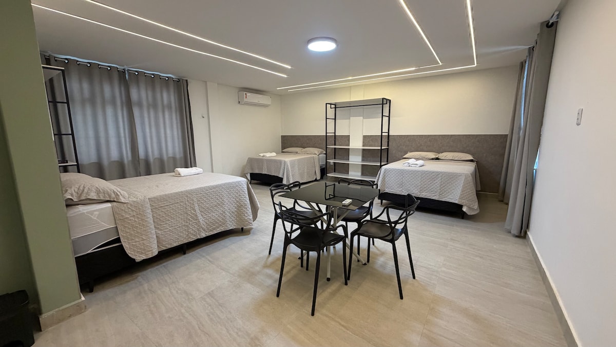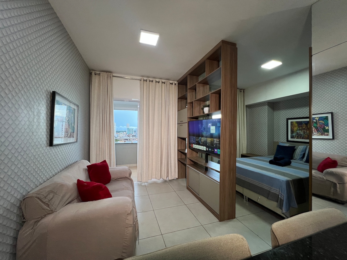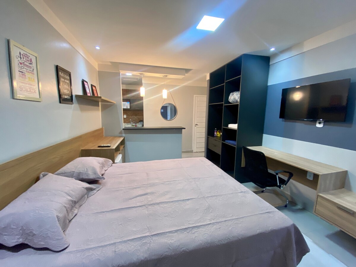 Parfait pour les couples et les voyageurs, ce loft moderne dans un nouveau bâtiment présente les caractéristiques suivantes : ✅ ** grand LIT** (draps haut de gamme) ✅ **Piscine, salle de sport, espace barbecue et terrasse panoramique ** ✅ ** Wi-Fi ultra-rapide ** (fibre optique) et **SmartTV avec Netflix** ✅ **Cuisine entièrement équipée **, lave-linge et climatisation ✅ ** articles DE toilette gratuits** ET produits DE base fournis Emplacement calme à **Blue Building (Rua dos Caripunas 1016)** – idéal pour se détendre ou travailler à distance !