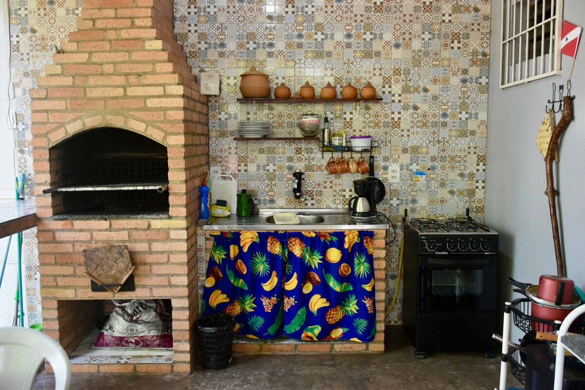 Altar do Chão, à environ 1 km (0,6 mile) des berges (15 minutes à pied, 5 minutes en voiture). Tranquillité et connexion à la nature. Notre villa se compose d'une suite avec réfrigérateur à l'intérieur de la chambre et d'une cuisine extérieure dans le patio. - Nous avons le Wi-Fi ; - Nous avons la climatisation ; - Nous avons des draps et du linge de lit ; - Place de parking ; - Rue non pavée ; rue parallèle pavée - un pâté de maisons et demi jusqu'à l'asphalte. - La saison des pluies (janvier-mai) peut affecter un peu la circulation.