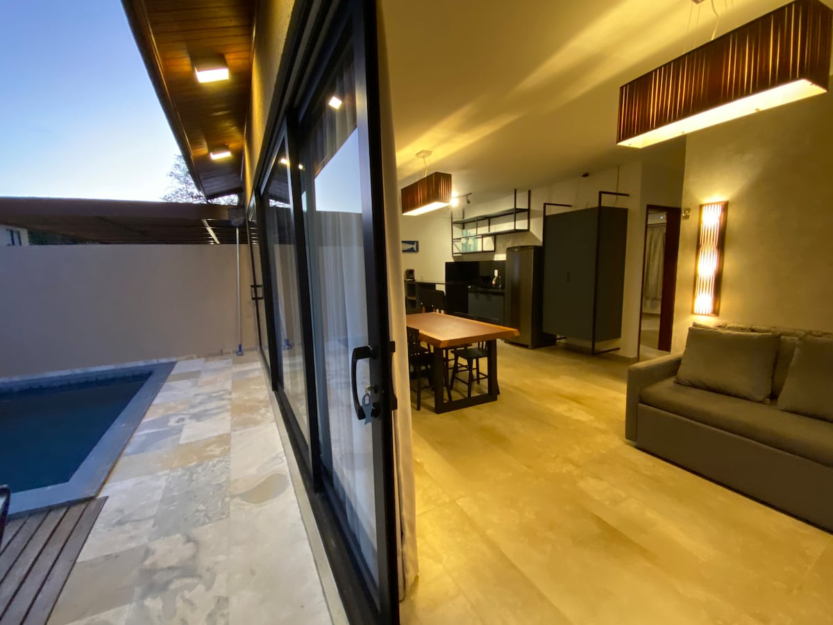 3 suites confortables, un salon et une cuisine ouverts, une piscine privée, une cheminée, un chauffage au gaz et une connexion Internet par fibre optique. Entourée de cocotiers, la maison, conçue par l'Atelier Branco primé, se distingue par ses jardins de cactus mandacaru soigneusement conçus et sa décoration raffinée. Situé dans un appartement en résidence exclusif avec 6 autres maisons et sécurité 24h/24, il se trouve à seulement 5 minutes en voiture de la plage et des meilleurs restaurants.