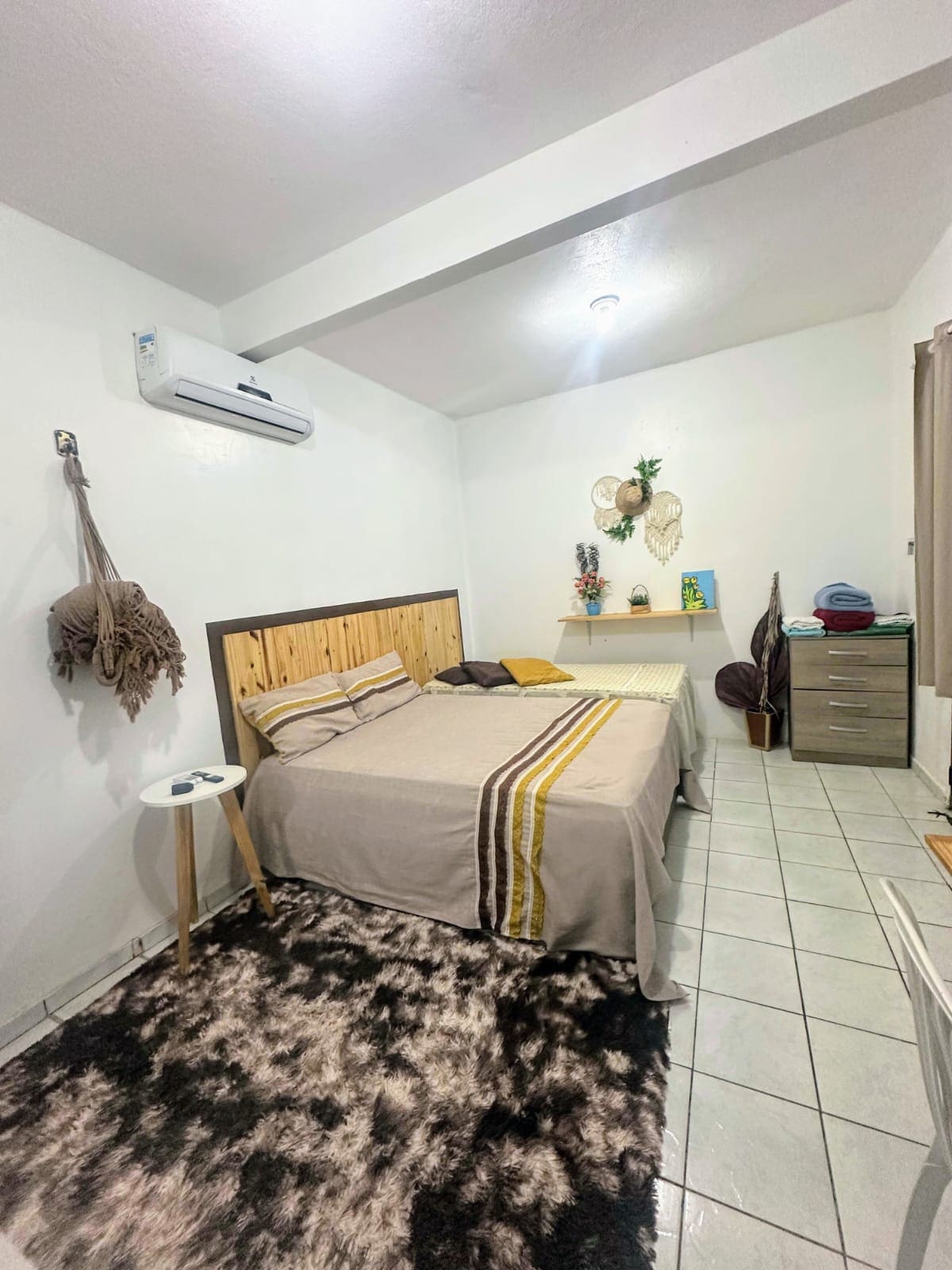 Apartamento individual, meio rústico com um espaço amplo, climatizado e confortável contendo: Uma Cama box casal, hack, TV Smart 43", arara de madeira com sapateira, armário pequeno. Mesa com cadeiras, frigobar, armário com utensílios doméstico, fogão elétrico (2 bocas), micro-ondas, panela air fryer, sanduícheira e liquidificador. Contém wi-fi e fica bem localizado, estando a uns 5 minutos do Aeroporto Int de Boa Vista, próximo de supermercado, farmácias, academias, faculdades, jornais, etc...