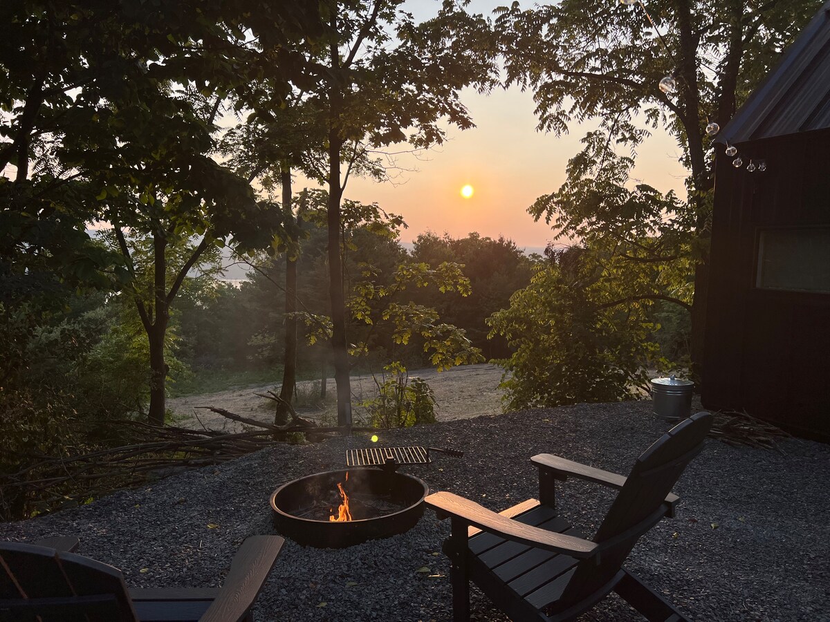 Nichée sur une colline surplombant le lac Seneca, admirez le coucher du soleil tout en étant allongé au lit ou depuis votre propre patio avec un feu crépitant. Nous sommes des hôtes locaux et nous veillerons à ce que vous passiez un séjour inoubliable ! Tout ce que vous pourriez vouloir faire dans les Finger Lakes sera à portée de main. Des caves à vin à profusion, deux même juste à côté, plusieurs brasseries à proximité, à quelques minutes du lac, à 15 minutes du centre-ville de Watkins Glen, à 10 minutes des sentiers de randonnée dans la forêt nationale, ou restez, détendez-vous et profitez de la vue !!