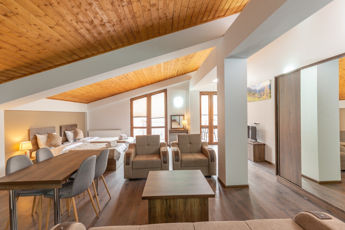 Cozy studio with king size bed, two single sofa beds and one double sofa bed. The building has great location, it is right next to Gondola lift.