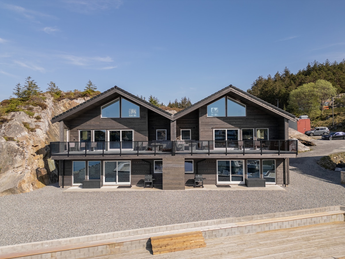 En hytte fra 2017 med nydelig sjøutsikt som kan nytes fra de store vinduene eller fra jacuzzi på terrassen. Interiøret har rolige naturfarger, nordisk stil. Peis i stue, åpen løsning fra kjøkken. 1.etg: 2 soverom, 2 bad, stue og kjøkken, samt vaskerom og entre. 2.etg: 2 soverom og hems med dobbel sovesofa. Totalt 14 senger, pluss reisesenger. Evt ekstra madrasser til gulv. Flotte turmuligheter i nærområdet, båtutleie, samt en fin liten sandstrand nedenfor Panorama hotell og resort like ved.