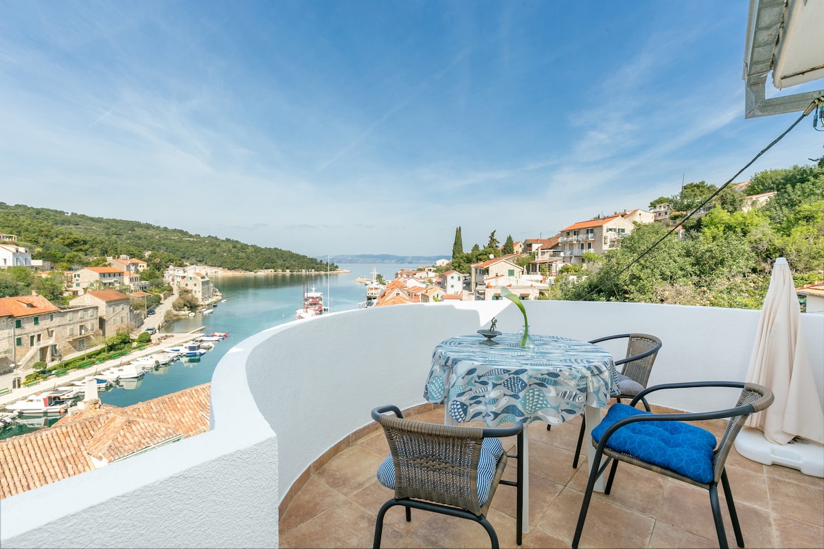 Bienvenue dans notre confortable appartement penthouse d'une chambre sur l'île de Brač bénéficiant d'un espace de 65 m ² et d'un balcon. Notre maison familiale est une maison traditionnelle en pierre dalmate construite à seulement 6 m de la mer sur la propriété de 1500 m ² cachée à l'ombre des arbres méditerranéens de 50 ans. Ceux qui veulent passer leurs vacances dans l'endroit calme à côté de la mer devraient venir à nous – dans notre petit village de Bobovišća na Moru au sud-ouest de l'île.