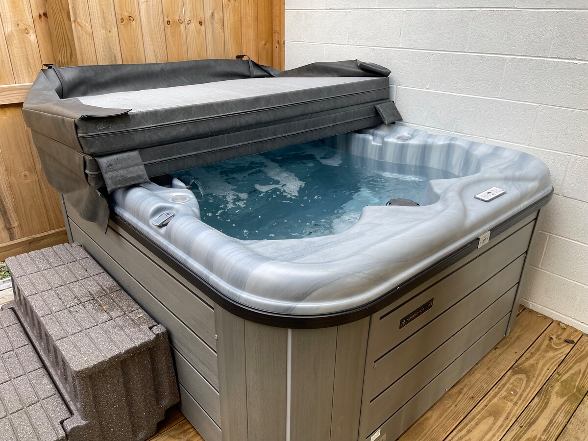 Parking privé avec un pont piétonnier de 30 pieds surplombant un ruisseau pour vous conduire au chalet. Chambre Queen en bas ; un escalier en colimaçon vous emmène à votre chambre Queen en loft ; une salle de bain complète ; une cuisine complète ; TV/WIFI ; hamac de loft intérieur ; porche couvert enveloppant ; zone de douche extérieure couverte d'arbres avec jacuzzi ; porche arrière couvert pour dîner. Grande zone de foyer avec bois de chauffage séché. Grand hamac extérieur de 12 pieds x 12 pieds à côté du foyer. Barbecue au charbon de bois Park Series à l'extérieur.