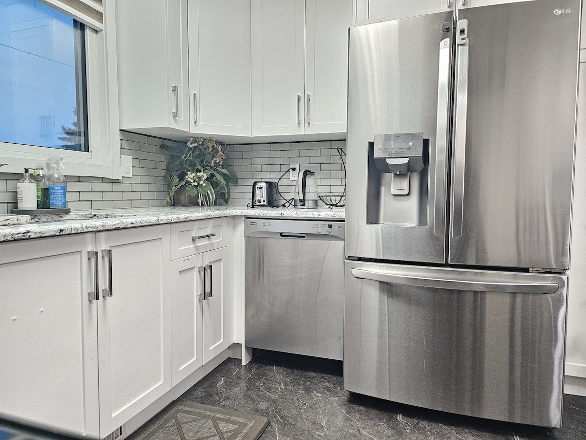 Passez un bon moment en famille dans cette retraite élégante ! Animaux acceptés. Vous êtes à quelques minutes de Whitemud Dr. & Anthony Henday qui vous relient à n'importe quel coin d'Edmonton à un maximum en 30 minutes. Proche de toutes commodités et épicerie. Cuisine entièrement équipée, WIFI, SMART TV, lave-linge/sèche-linge. Parfait pour un séjour rapide ou pour des visites plus longues dans la région d'Edmonton ou de Sherwood Park. Veuillez noter...les résidents à l'étage, vous pouvez entendre des pas :) 1 PETIT chien seulement. PAS DE CHATS, très allergique à eux :(