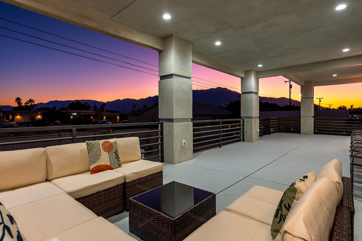 Magnifique maison de luxe pour grands groupes, pouvant accueillir 10 personnes. Vaste cuisine gastronomique avec une immense table à manger en marbre donnant sur la piscine, le spa, le foyer, le barbecue et les repas en plein air. À quelques minutes du centre-ville de Palm Springs, dans une rue calme Chiens bienvenus ! Cuisine de chef entièrement équipée Regardez vos émissions sur une tele 75 pouces avec de canapés-lits. Jouez au billard dans notre salle de jeux équipée d'un sauna IR portable