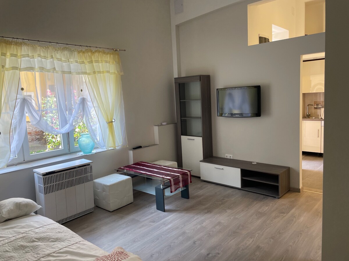 Petit appartement confortable et pratique avec climatisation. Le café du matin et les repas peuvent être pris dans le jardin confortable de l'appartement. La basilique et le centre-ville sont accessibles en quelques minutes à pied. Le Danube coule à cent mètres, le long duquel une piste cyclable et une promenade mènent au centre-ville et au pont menant à la Slovaquie. En traversant le pont, vous pouvez rejoindre la place principale de Párkány, pour une bonne bière pression slovaque. Le stationnement devant l'appartement est gratuit. Les cyclistes ont l'avantage de pouvoir garer leur vélo en toute sécurité dans le jardin fermé.
