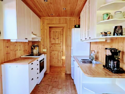 Cabine confortable, compacte, petite et pratique derrière une clôture de piquet peinte en blanc. La cabine contient 8 lits dans 2 chambres à coucher, un loft et une annexe. La cabine est petite, donc il se sentira probablement bondé avec 8, mais quand le temps est beau et que vous êtes beaucoup dehors, il n'y a aucun problème. Il y a une petite salle de bains avec douche, serviteur et WC, une cuisine et un petit salon confortable avec coin salon et coin repas. À l'extérieur, il y a un jardin avec une pelouse. Sur la terrasse, il y a un mobilier de jardin et un barbecue au gaz. À courte distance du magasin et beau terrain de randonnée.