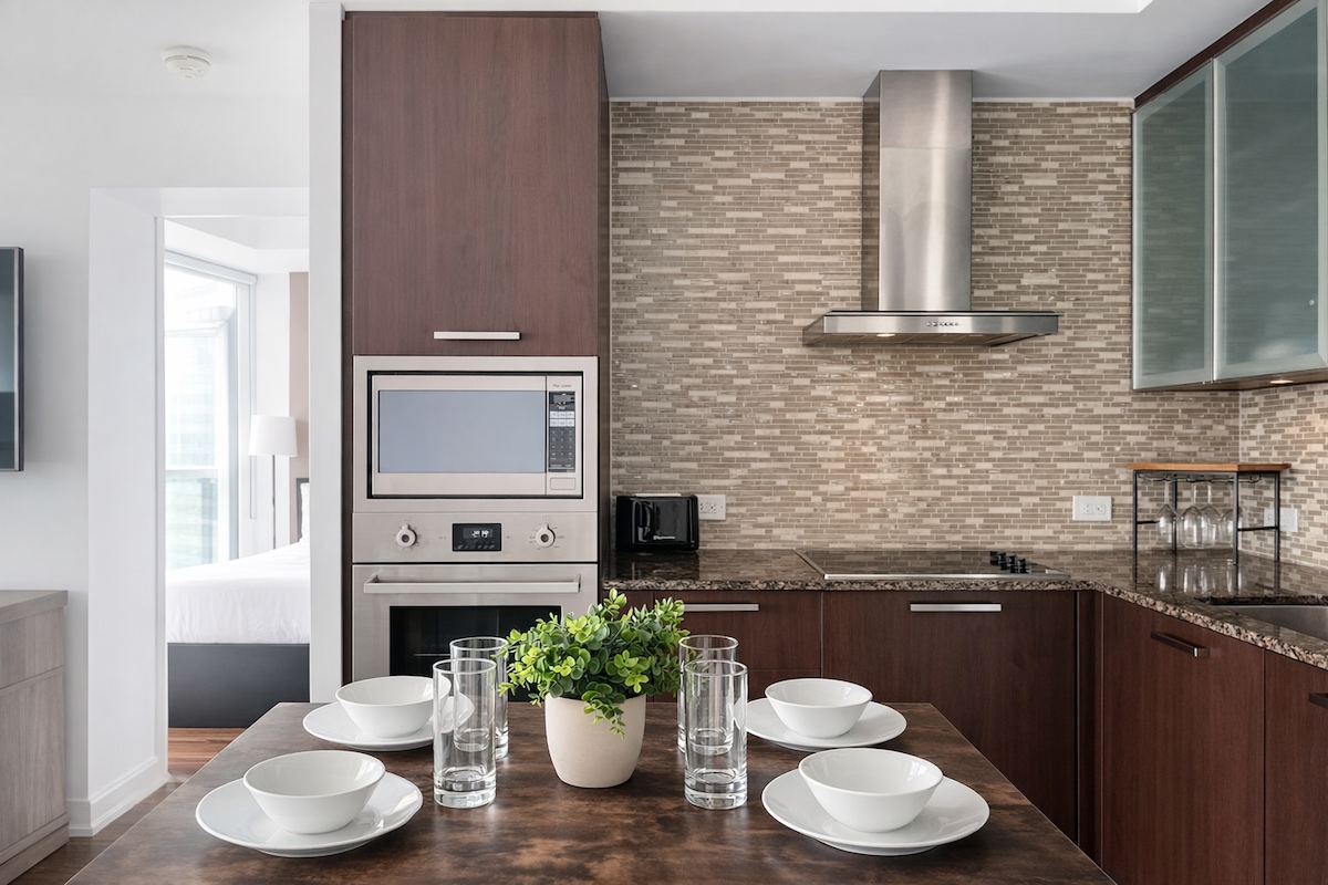 Séjournez au cœur du centre-ville de Toronto dans cet appartement moderne d’une chambre, à quelques pas de la Tour CN, du Rogers Centre et du front de mer. Le logement comprend un lit queen confortable dans la chambre et un canapé-lit dans le salon, parfait pour les couples ou les petits groupes. Profitez de la vue sur la ligne d’horizon à travers les baies vitrées ou détendez-vous sur le balcon privé. L’appartement comprend une cuisine complète, une télévision connectée, le Wi-Fi haut débit, ainsi qu’un lave-linge et un sèche-linge dans la suite. Les voyageurs ont également accès à une salle de sport et à une piscine extérieure.