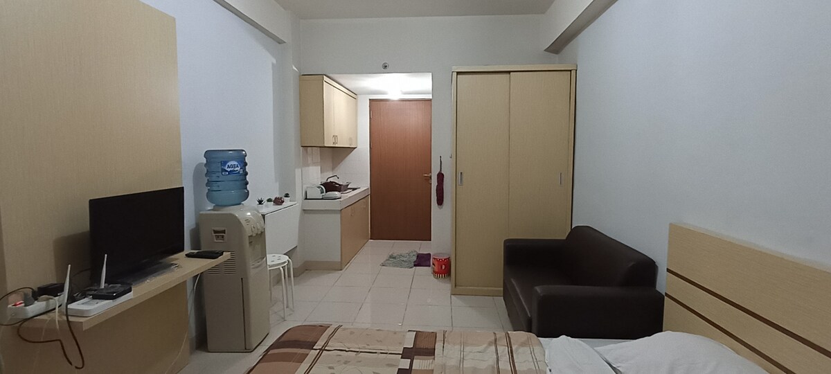 Bienvenue dans ce studio d'angle moderne, situé au cœur de Jatinangor, offre tout ce dont vous avez besoin pour une vie confortable et pratique. Ce studio d'angle est conçu avec un lit superposé confortable de 120x200 cm, parfait pour les voyageurs en solo, les couples ou même une famille avec 2 enfants. Il y a un bureau avec une connexion Wi-Fi haut débit et il y a deux balcons dans cette chambre La salle de bain privée est équipée d'une douche, d'un lavabo et de toilettes.