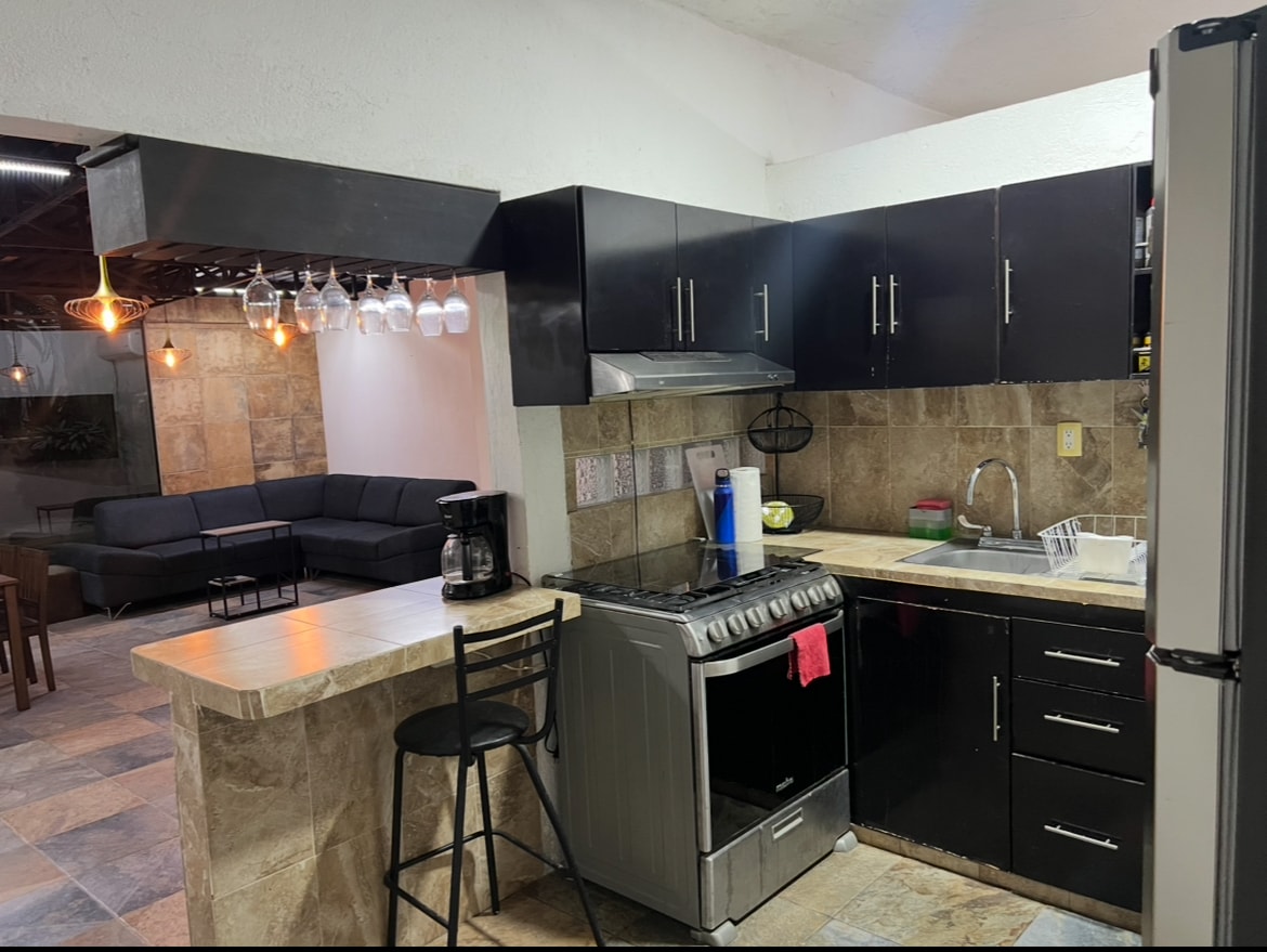 Maison avec des espaces confortables, comme un hamac en terrasse privée, studio avec bureau et fauteuil pour travailler et une terrasse avec salle à manger et chaises de jardin. La maison dispose de la climatisation dans toutes les chambres, ce que nous avons climatisé à la suggestion de nos clients. Il y a deux télévisions : une dans le salon au rez-de-chaussée et celle-ci dispose de Netflix. La deuxième télévision est dans la chambre principale et il y a Netflix et Megacable.