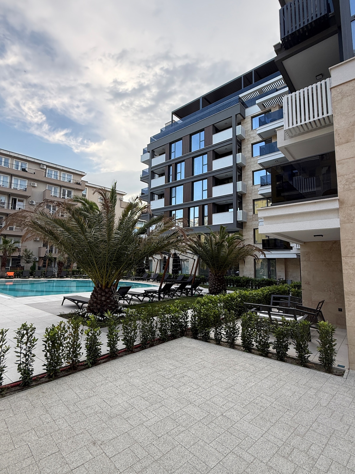 Відпочиньте й розслабтеся в затишній і стильній оселі.Чудова новенька квартира,ще без жодної здачі.З новенькими меблями,сучасною потрібною технікою,затишною атмосферою.Квартира знаходиться в невеличкому сімейному комплексі,де Ви знайдете спокій та затишок.До Ваших послуг басейн,джакузі,лежаки.Сам комплекс розташований в центрі міста ,поруч магазини,ресторани,центральний пляж та набережна,парк атракціонів.Відстань до моря 750 м